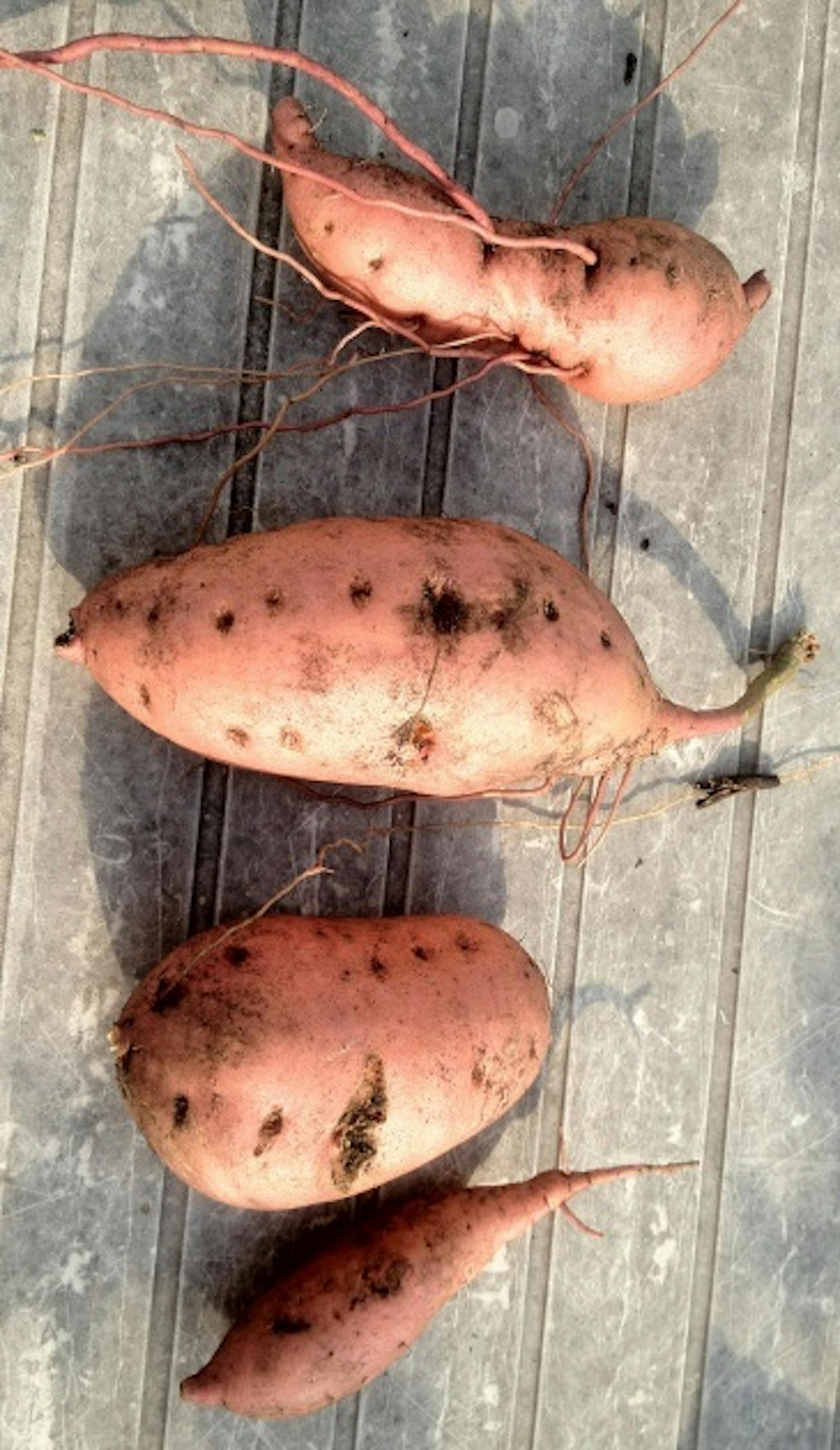 When I grasped the base of the vine and pulled, they came up cleanly like a fat bunch of carrots.A couple of the sweet potatoes from this plant are about six inches long, while the others are smaller. I'm going to leave the other plants in the bed as long as I can before I pull them.