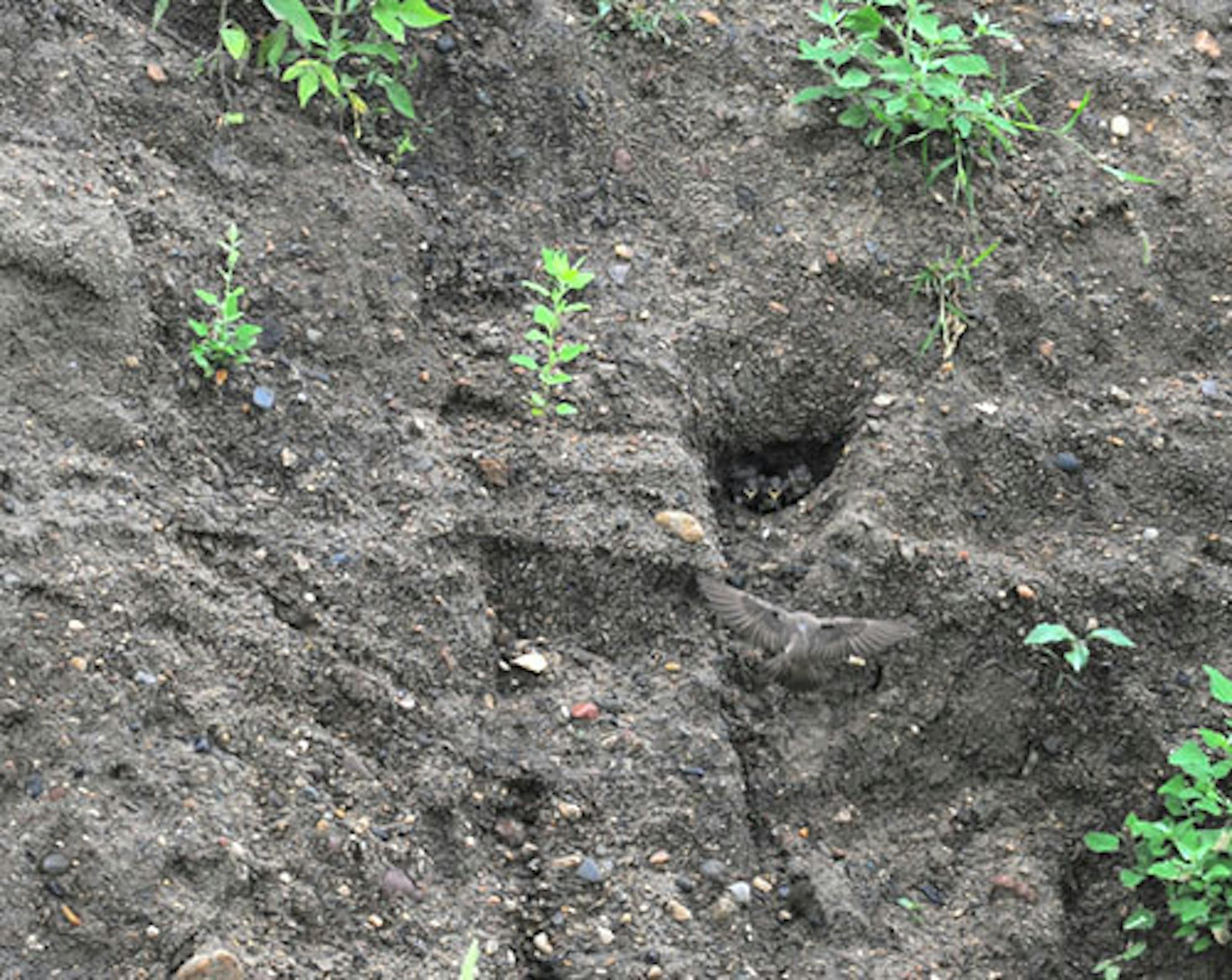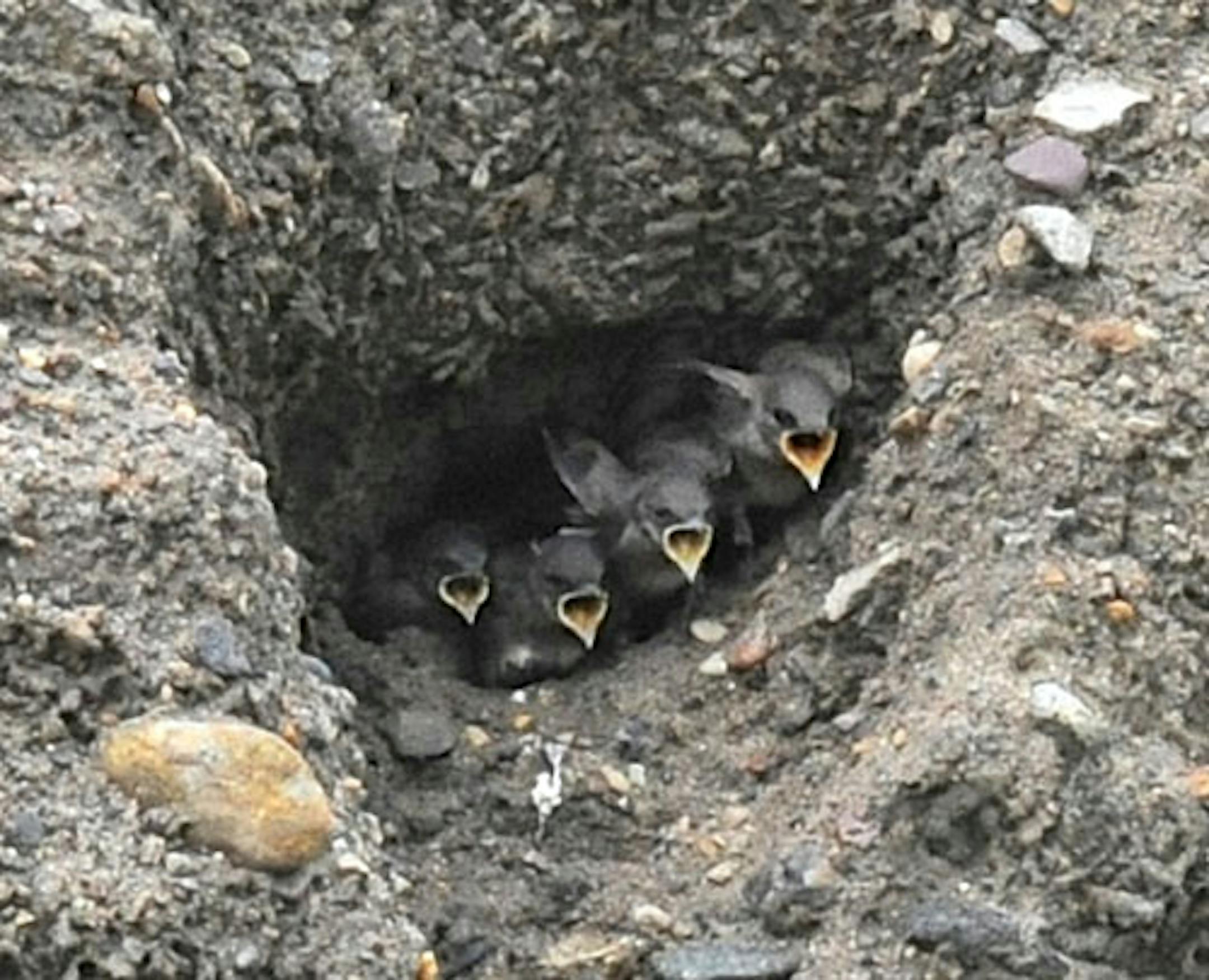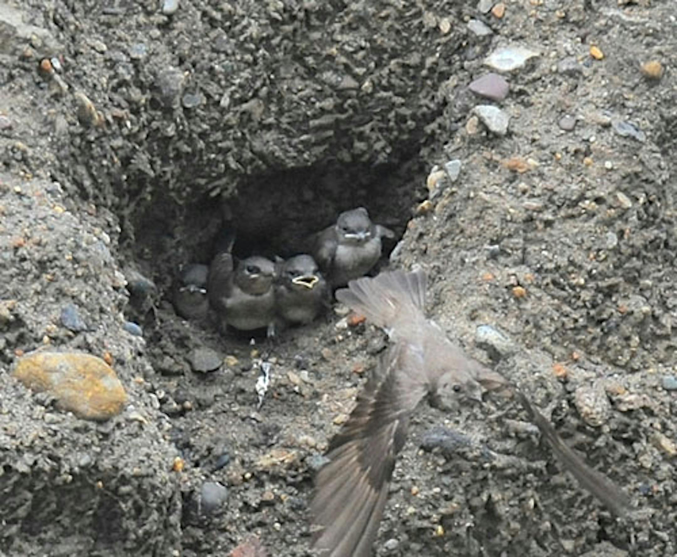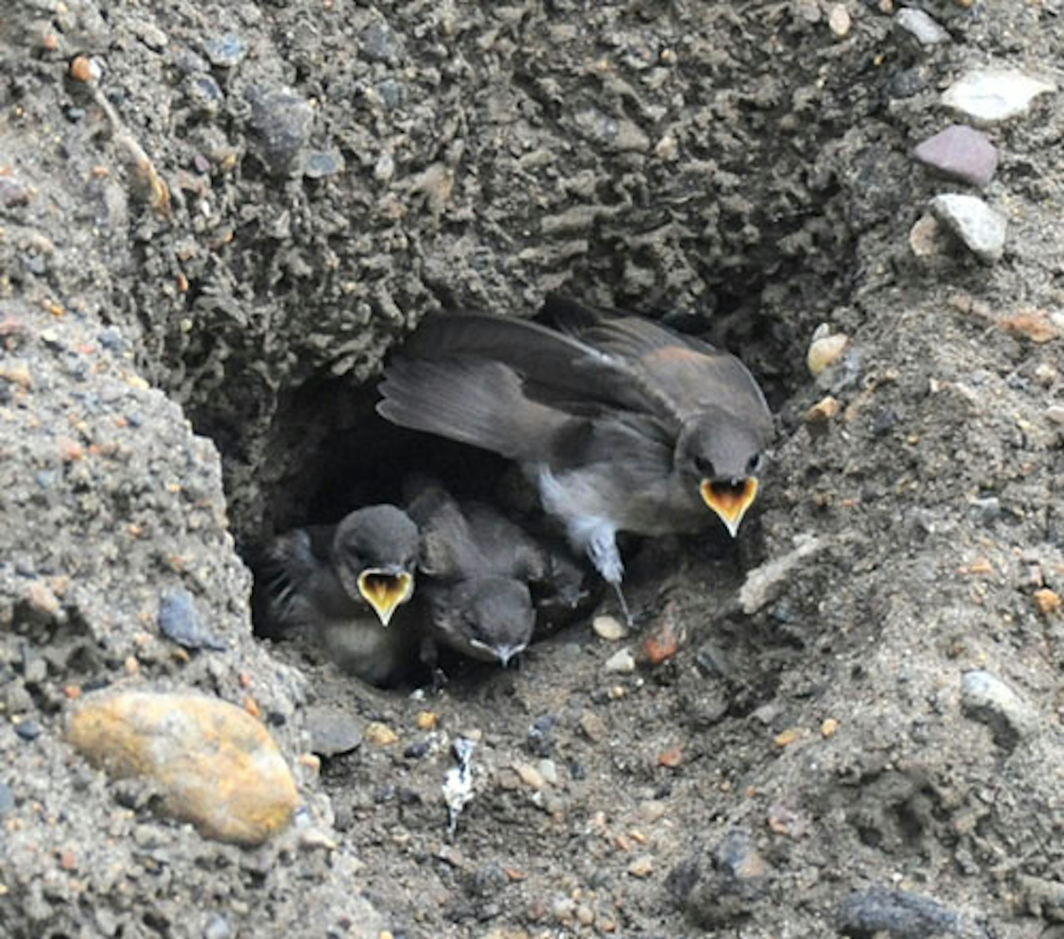 Here are some baby swallows, not seasonal at all. Checking iPhoto inventory I found a set of 31 images taken last July of a Northern Rough-winged Swallow nest cavity. Young birds were being fed by one of their parents. Today is a bright cold January day; it feels good to work with photos from a warmer month. The nest hole was dug in a large pile of black dirt in a city maintenance yard near our Orono home. Two swallows began excavation of nest sites. One nest was completed. There are four young birds in the nest, one more aggressive than the others. This is often the case with altricial bird species, young fed in the nest until fledging. These birds are near that point, certainly the bird on the right. It pushed its way to the head of the chow line more times than not, probably why it appears stronger than its siblings.