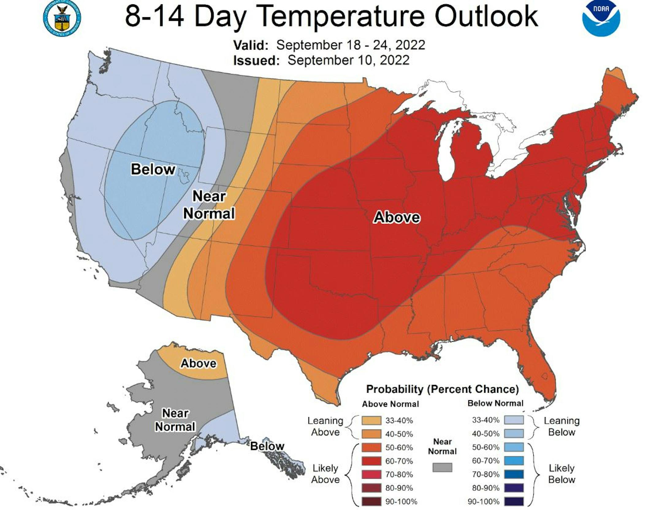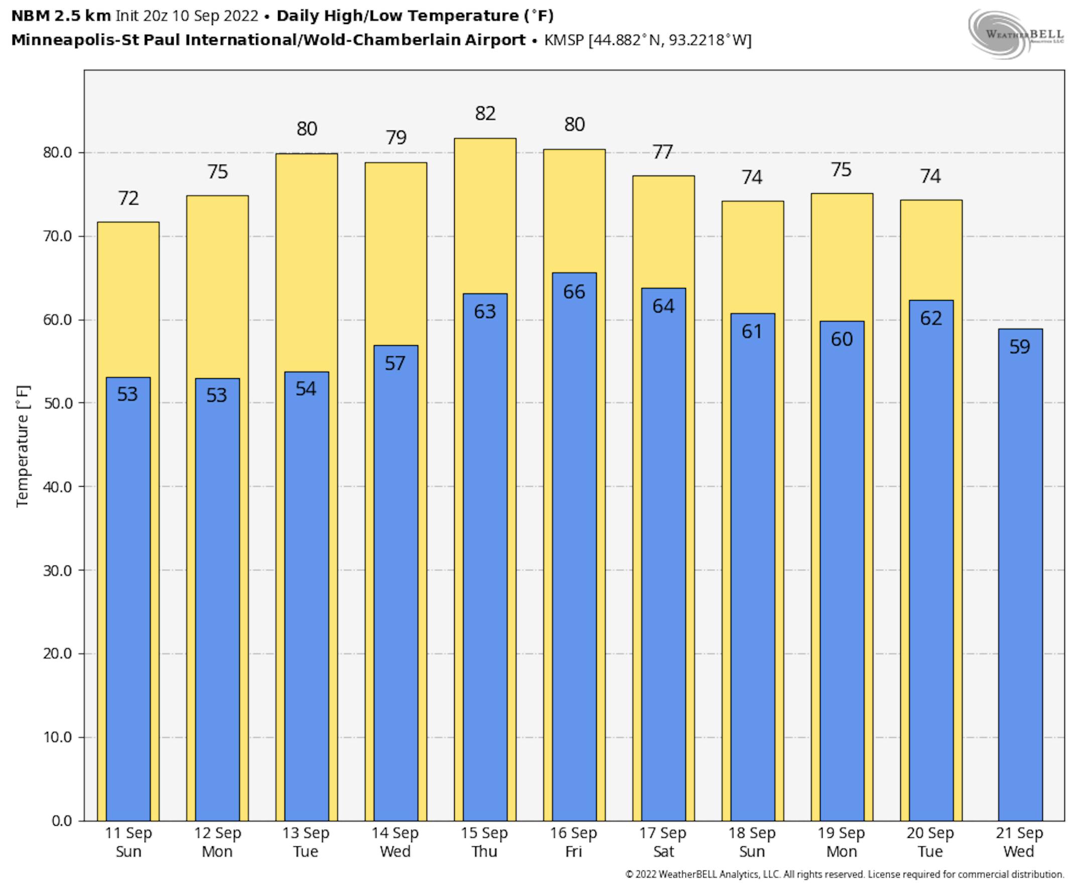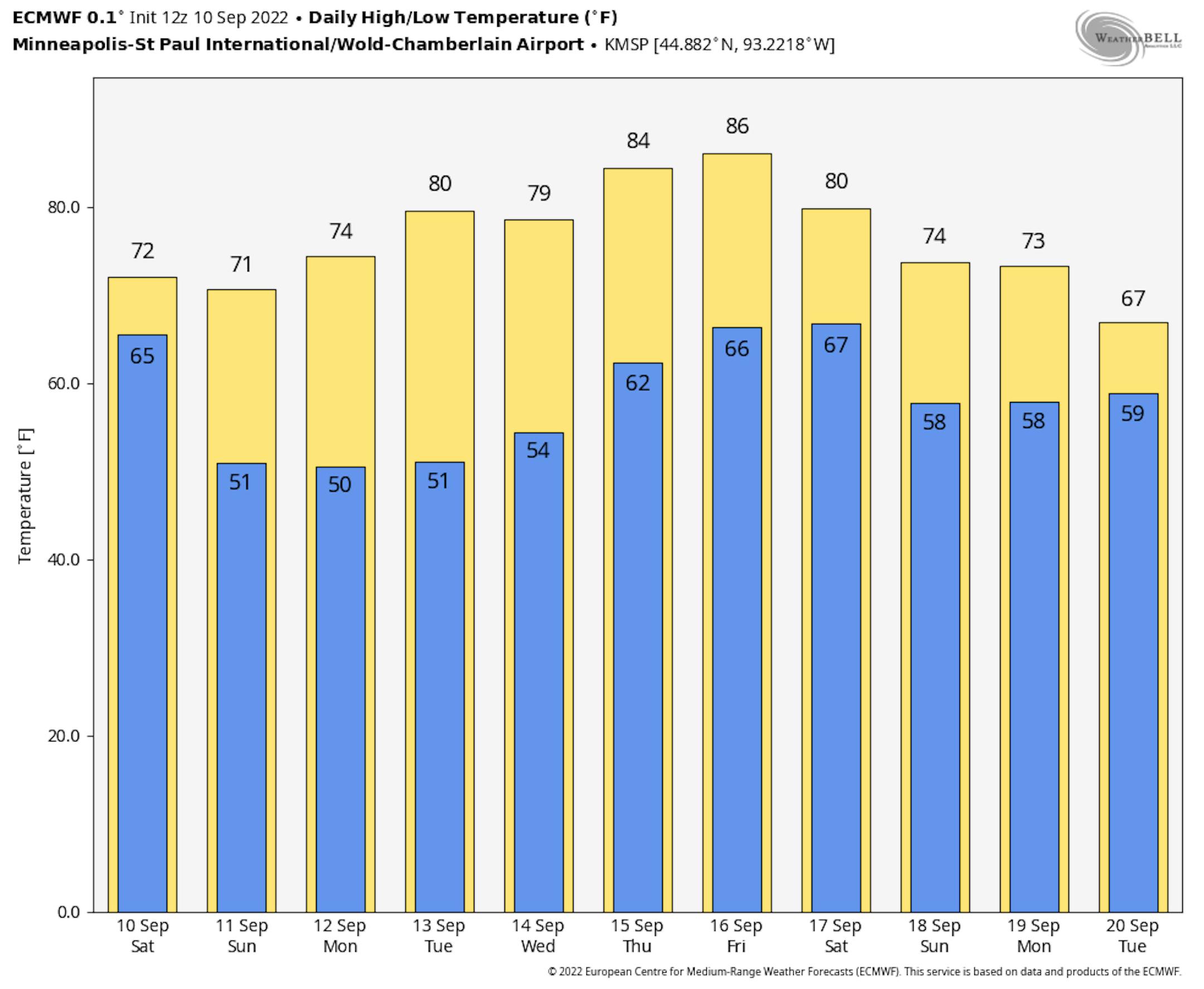 The extended temperature outlook for Minneapolis shows readings running close to average through Monday, before a modest warmup arrives around midweek. Temps will warm into the 80s once again, which will be nearly +5F to +10F above average for mid September. Summer isn't over yet, but our days are numbered...