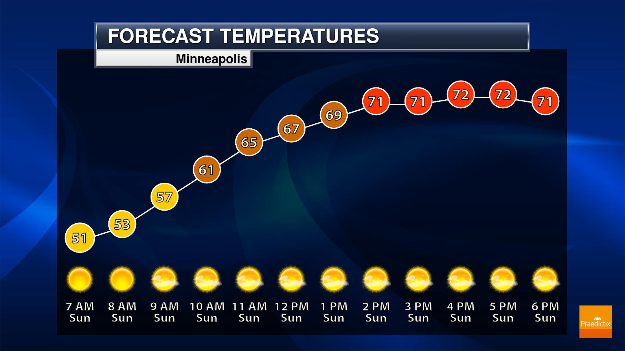 The hourly forecast for Minneapolis on Sunday shows temps starting around 50F in the morning with highs topping out in the low/mid 70s in the afternoon. Again, it'll be a dry and comfortable day with a decent northerly breeze. It'll be a great day for tailgating and outdoor sports. Enjoy!