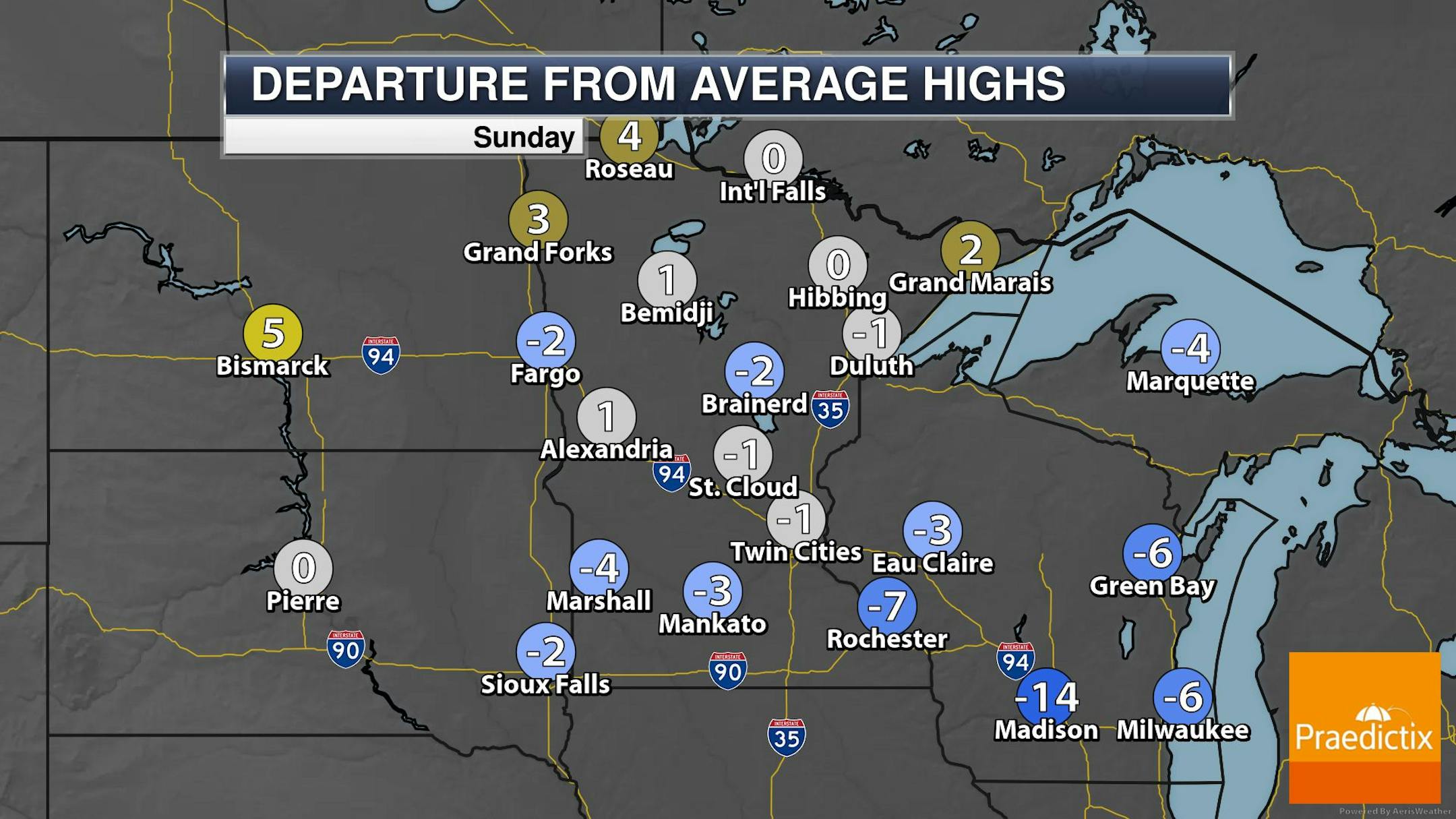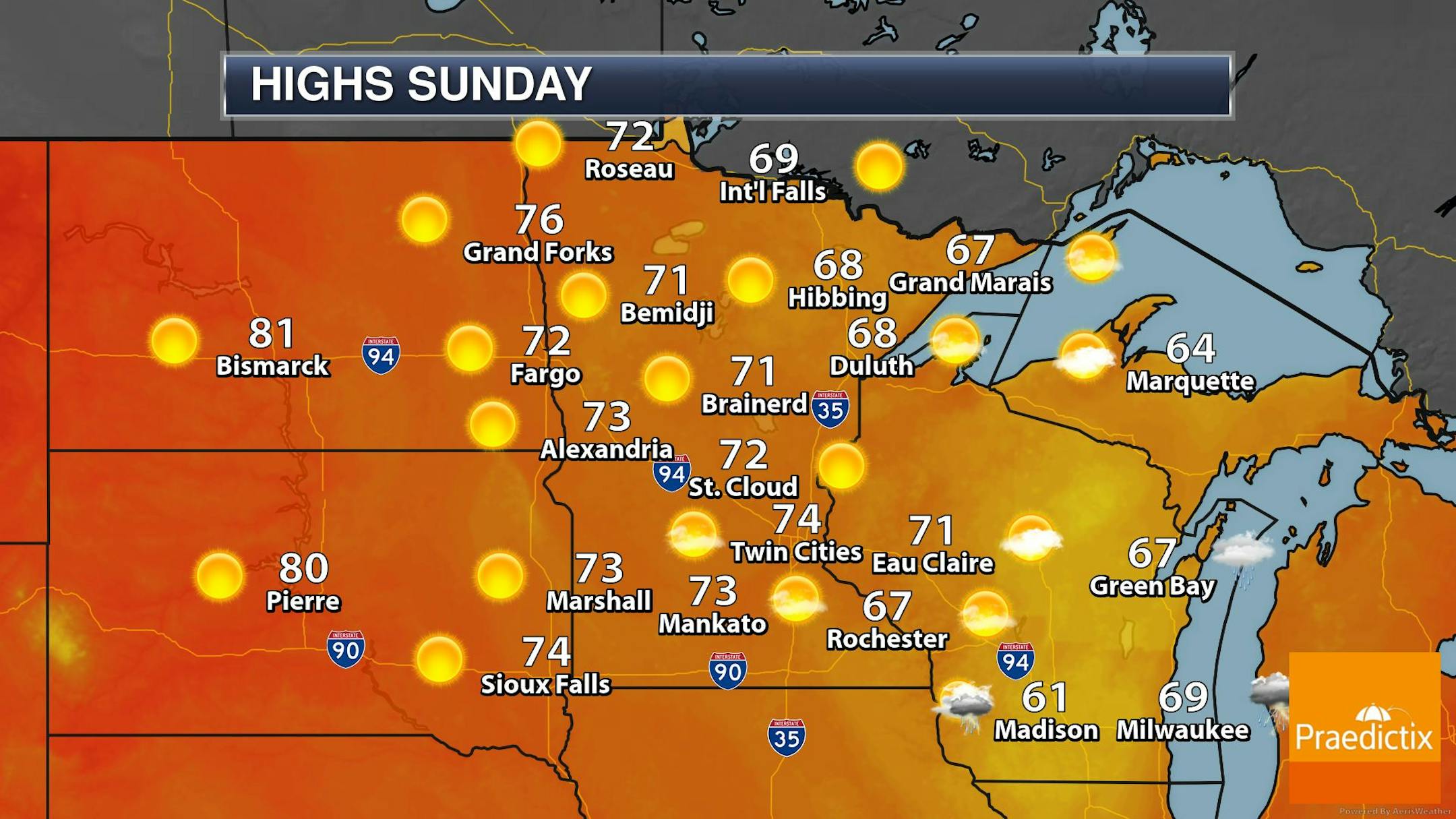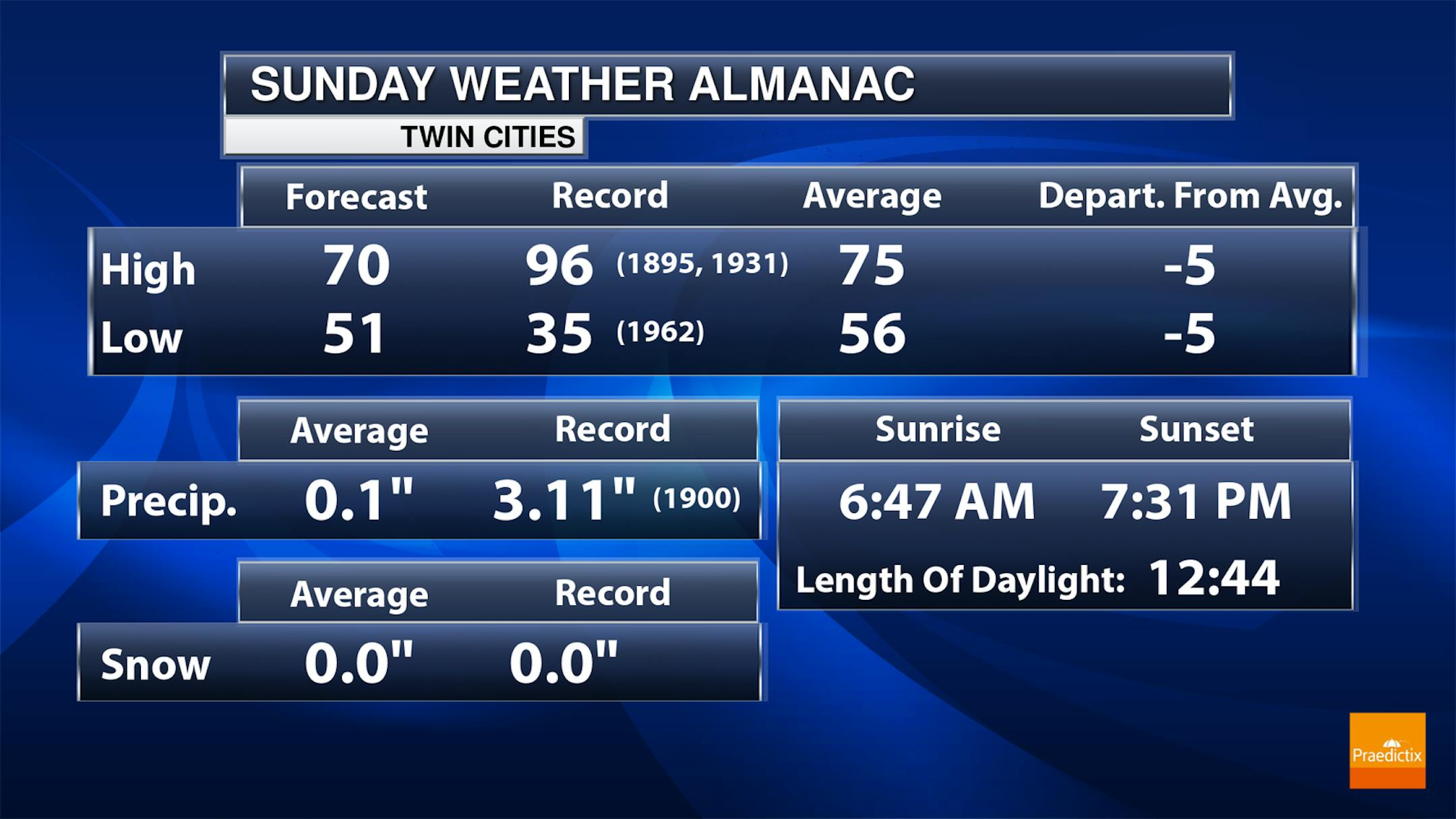 The weather outlook for Sunday shows beautiful conditions in place across much of Minnesota and the Dakotas with highs generally warming into the 70s and lower 80s. Readings will be fairly close to average, but lingering showers and a few storms across central and southern Wisconsin will keep things cooler than average with highs only warming into the 60s.