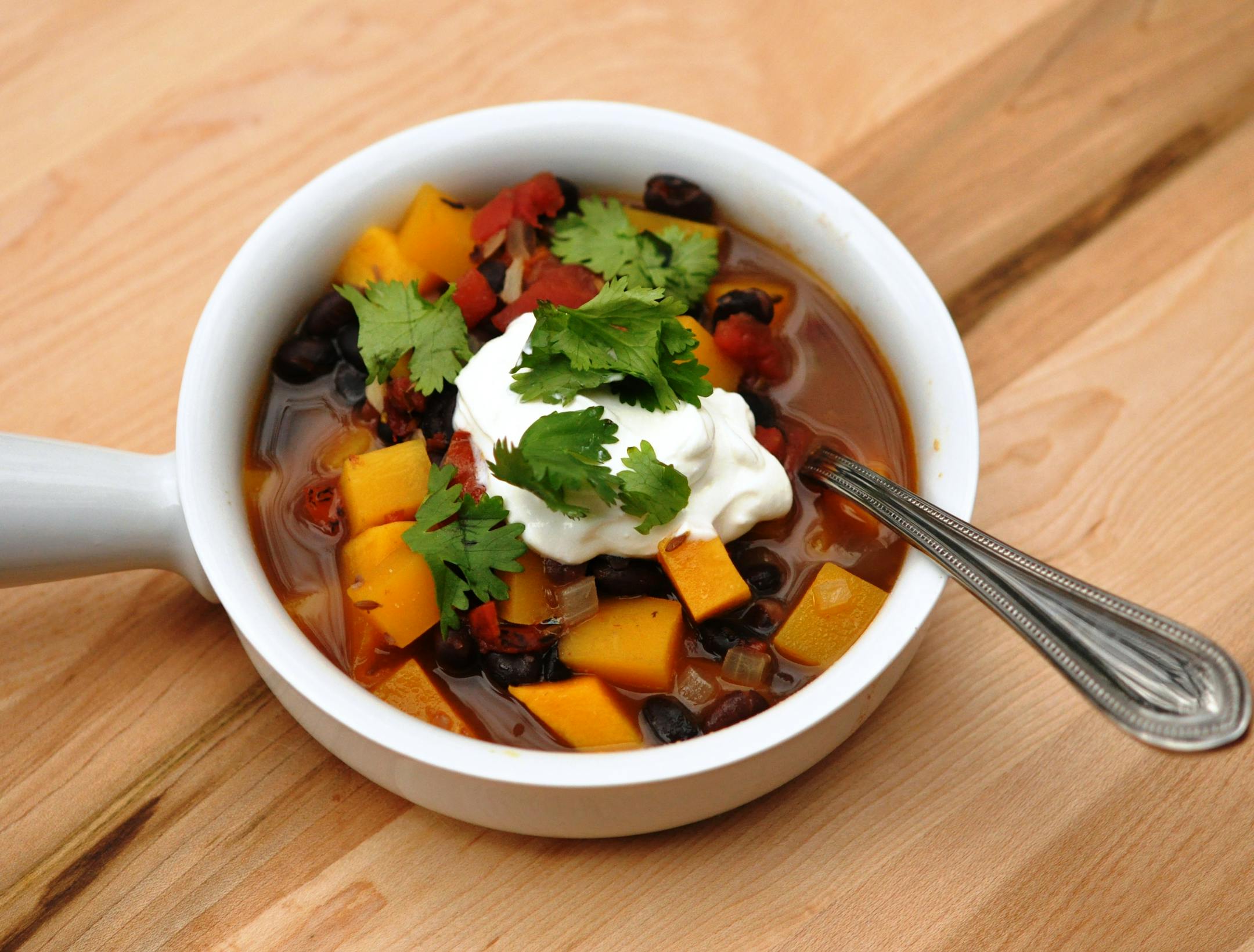 One of the easiest and most delicious meals I make for my family, Smoky Black Bean and Butternut Squash Chili, comes from items I almost always keep in my pantry: canned beans, tomatoes, chipotle chiles in adobo sauce and winter squash. The balance of spicy, smoky, earthy and sweet is perfect in this quick and easy dish, and nothing is more satisfying on a cold night. It makes a fairly large amount and is even better on Day 2, so I know I can get a couple of meals out of one batch, and that's something that will always get my vote.