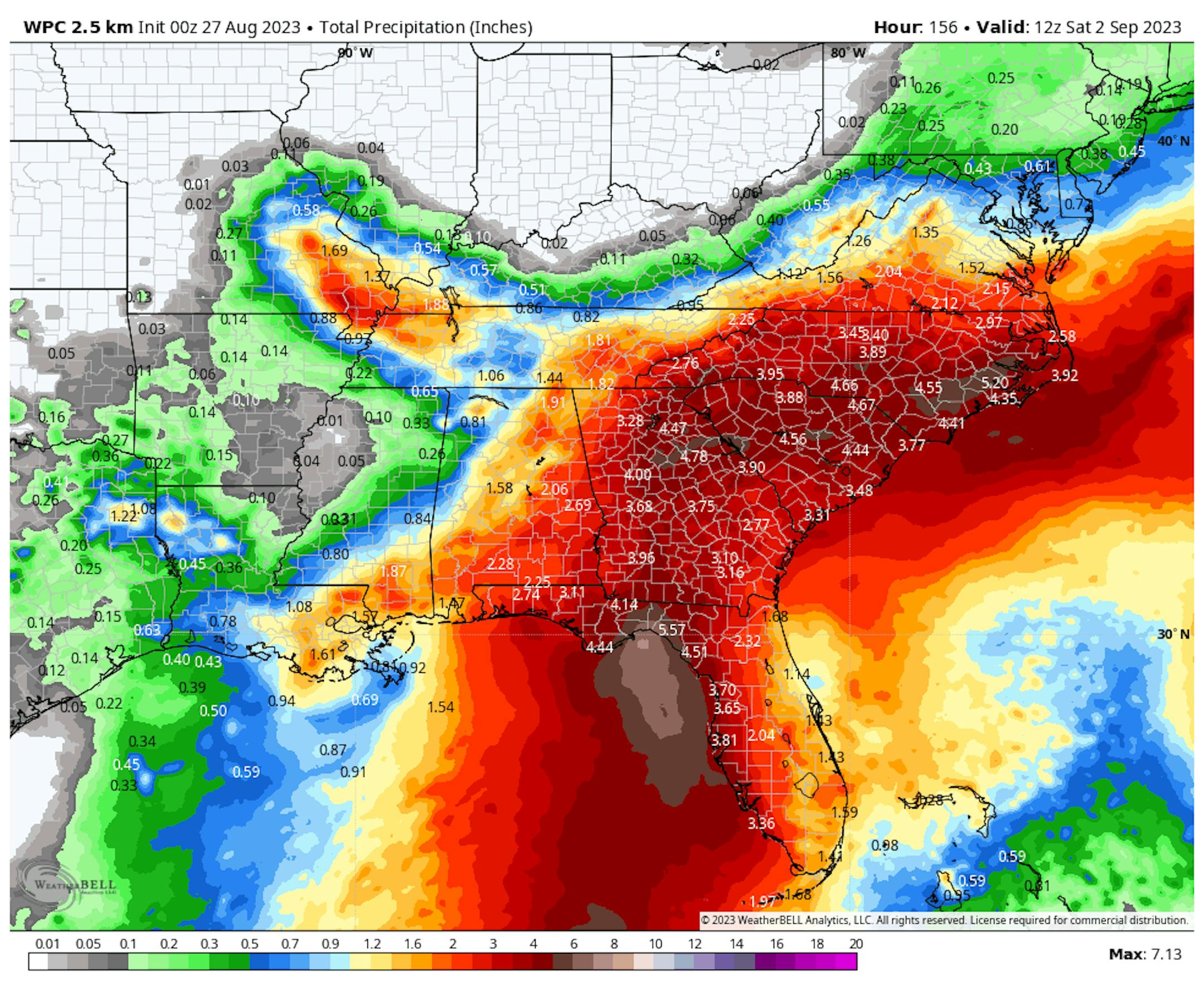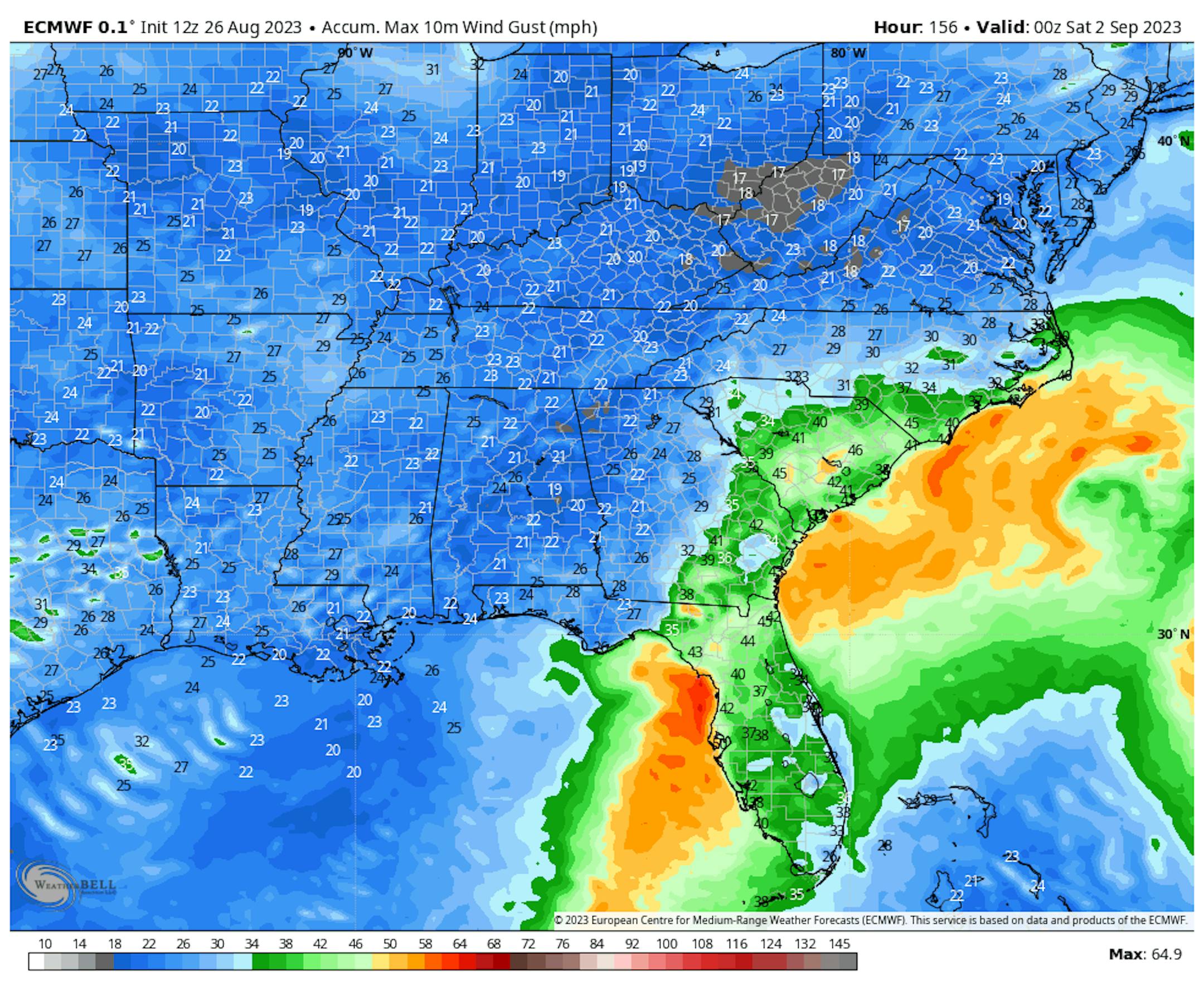 Regardless of how strong this storm gets, heavy rain will be one of the main concerns here. Widespread 3" to 6" or more will be possible from Florida through the Mid-Atlantic States, which could be problematic in terms of flooding.