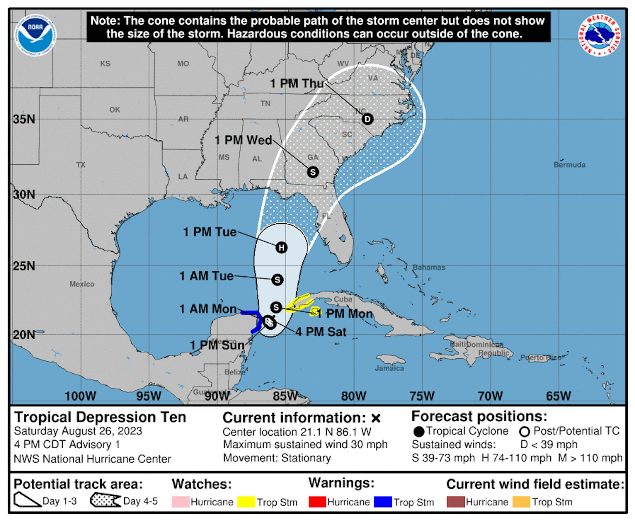 The National Hurricane Center starting issuing advisories for Tropical Depression TEN midday Saturday for a wave that was located just east of the Yucatan Peninsula. This storm will continue to lift northeast over the next few days and will likely intensify before making landfall along the Florida coastline as Tropical Storm or a Hurricane "Idalia" around midweek.