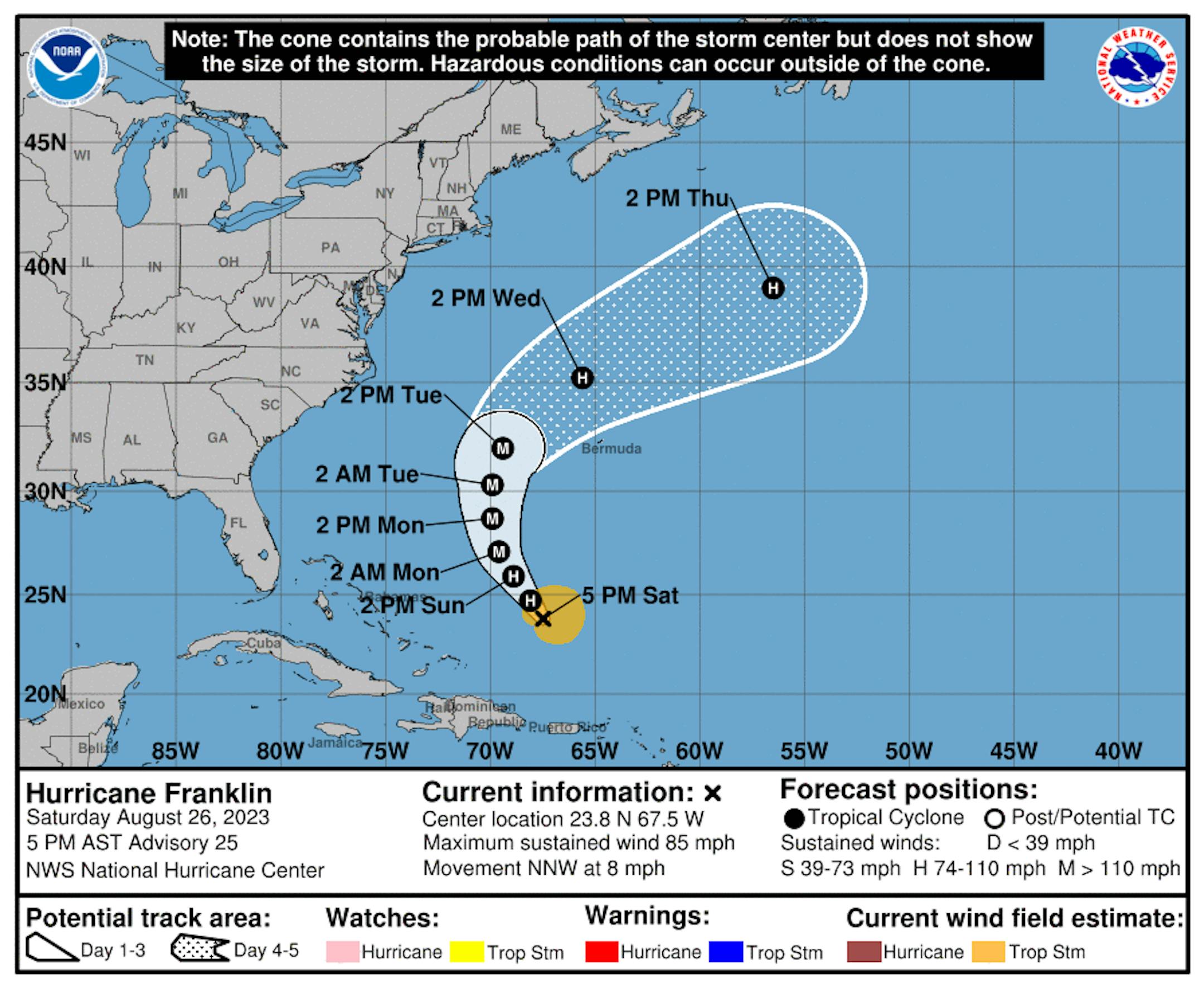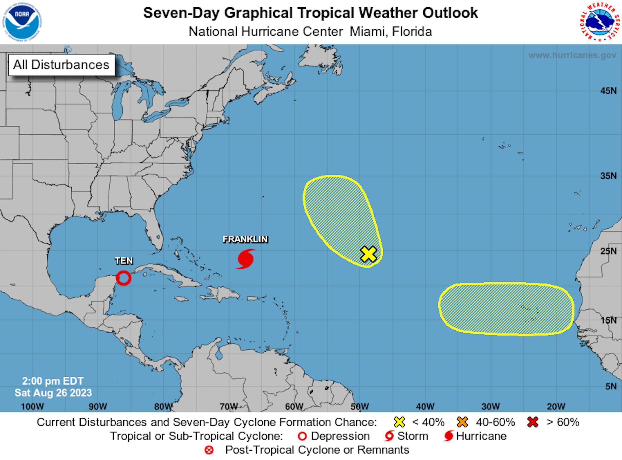 As of midday Saturday, we had several disturbances ongoing in the Atlantic Basin, including Hurricane Franklin and Tropical Depression TEN.