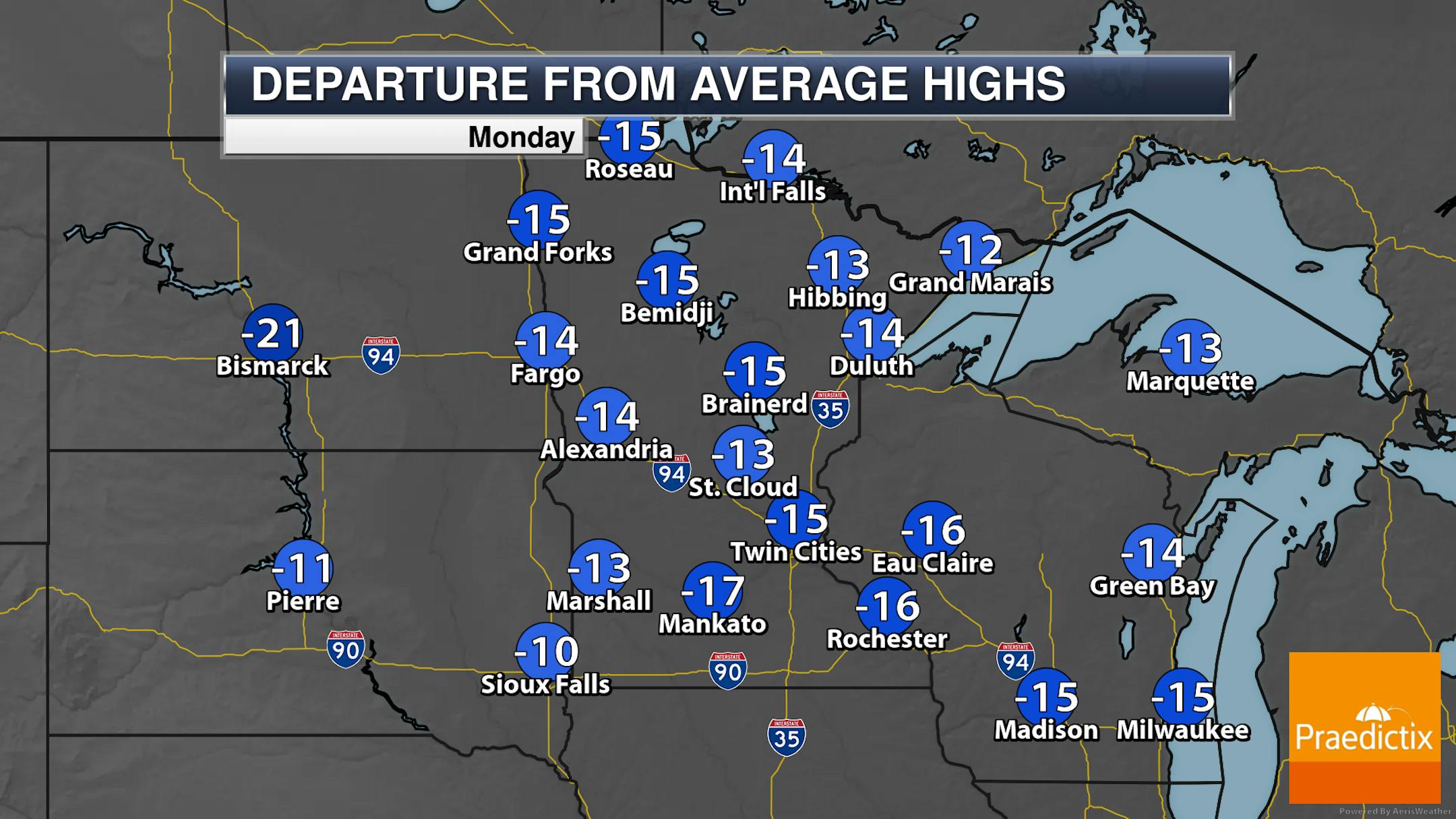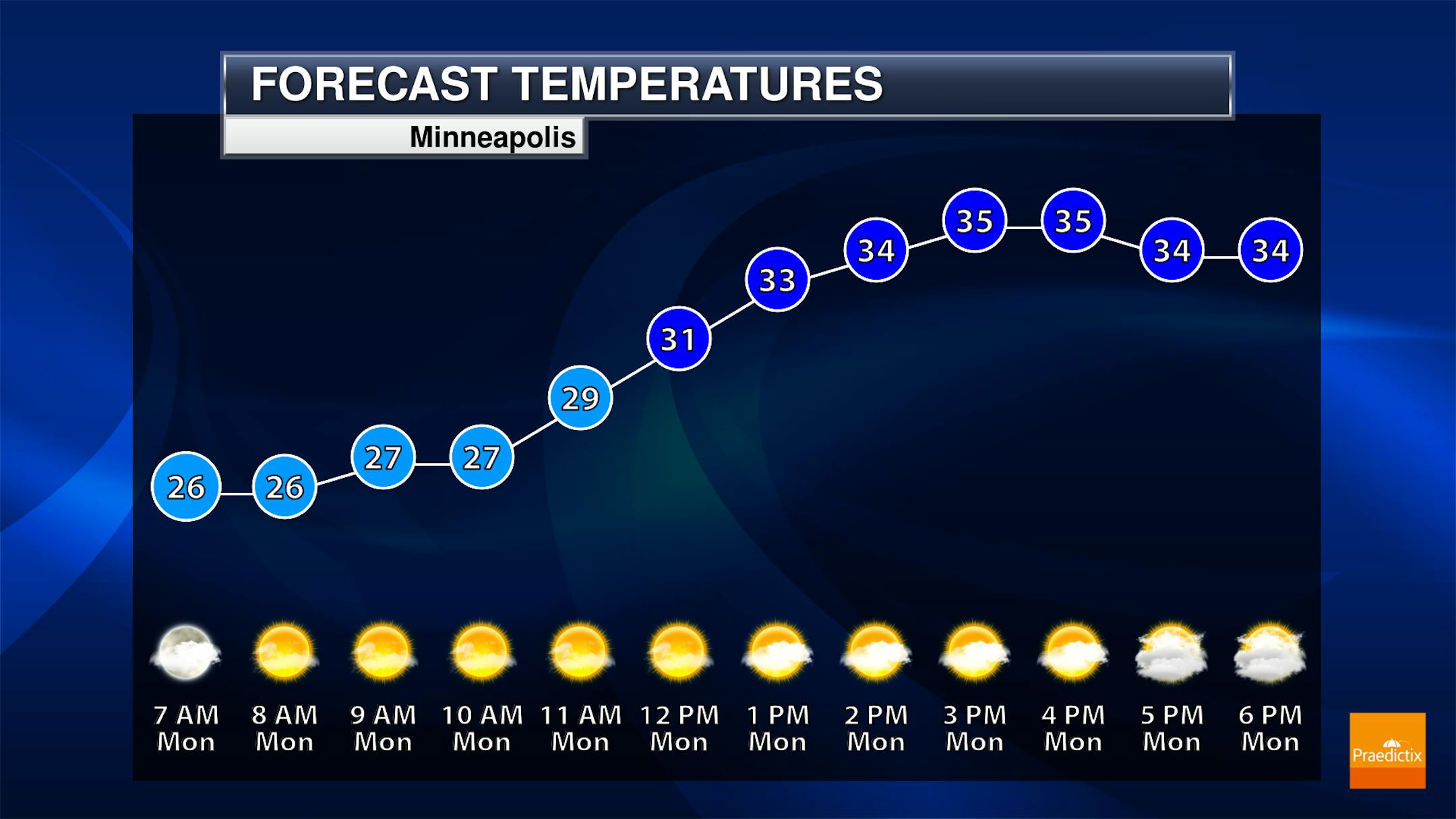 While we will start off with sunnier skies on Monday in the metro, clouds will be on the increase into the afternoon hours as a clipper system approaches out of Canada. Morning lows will be in the mid-20s with highs only climbing to the mid-30s (about 15F degrees below average).