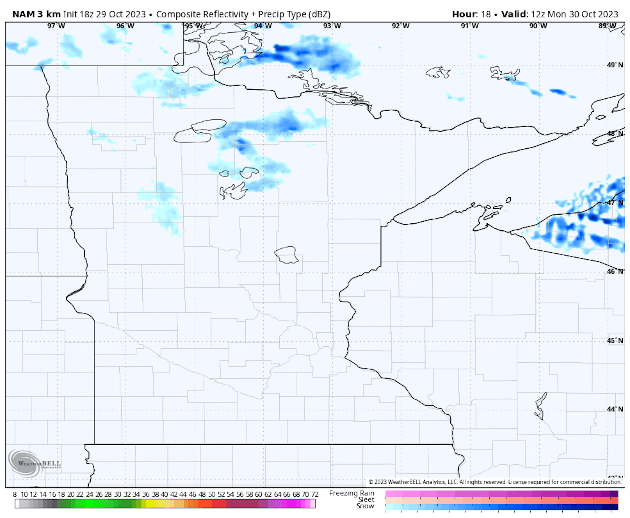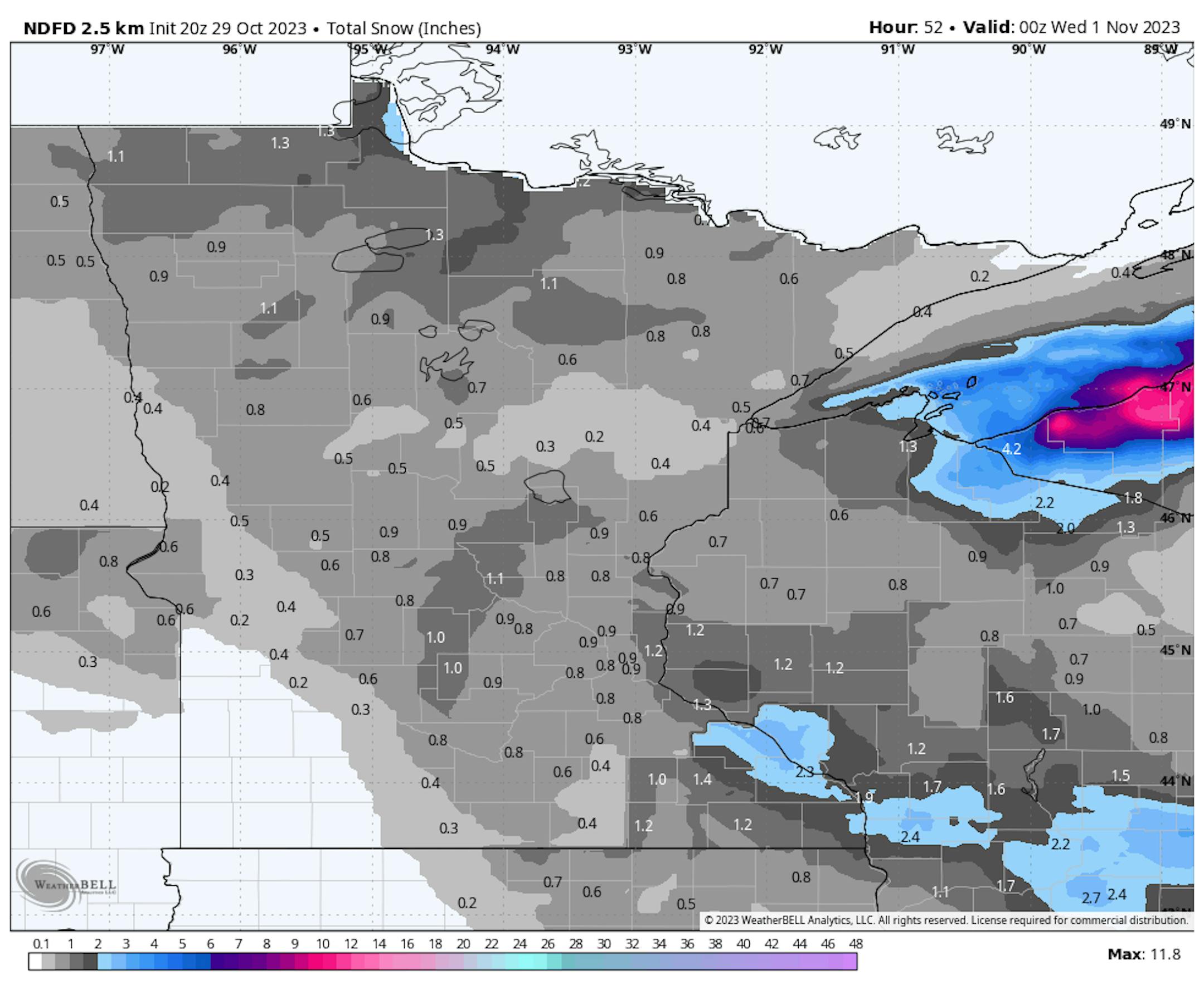 This system will bring the potential of half an inch to about an inch and a half of snow across a good portion of Minnesota into western Wisconsin to begin the week. Outside of parts of northern and southern Minnesota, this will be the first accumulating snow of the season. There could be a few areas of Minnesota - up near Lake of the Woods and along the Mississippi River southeast of the metro - as well as parts of western Wisconsin that see 2-2.5" of snowfall.