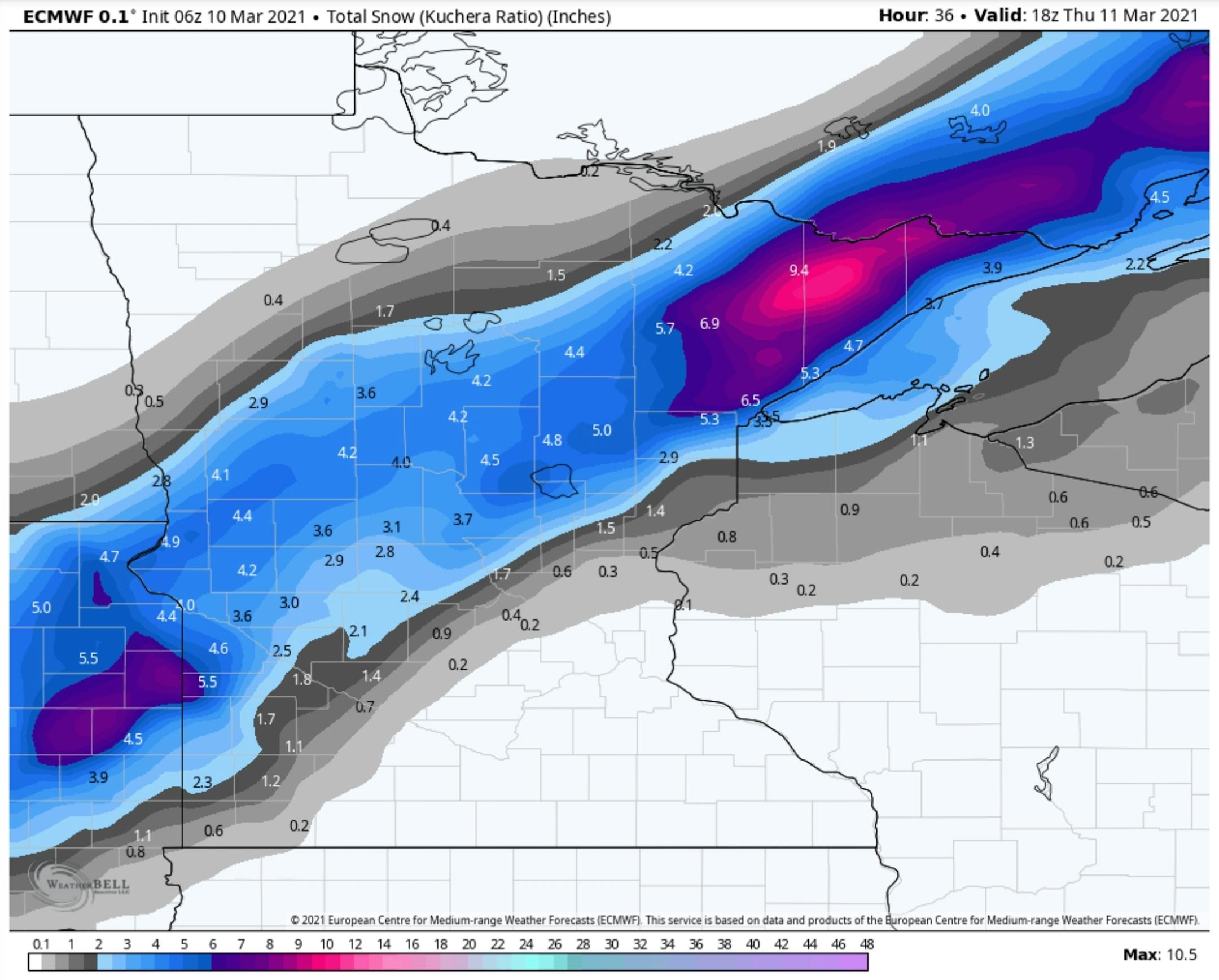 Snowfall Potential. The 06z run of ECMWF (the European model) still shows a semar of 2-5" from near Alexandria and Brainerd to Duluth and the North Shore. Accumulating snow and a slight tornado risk in the same state at the same time. Only in Minnesota.