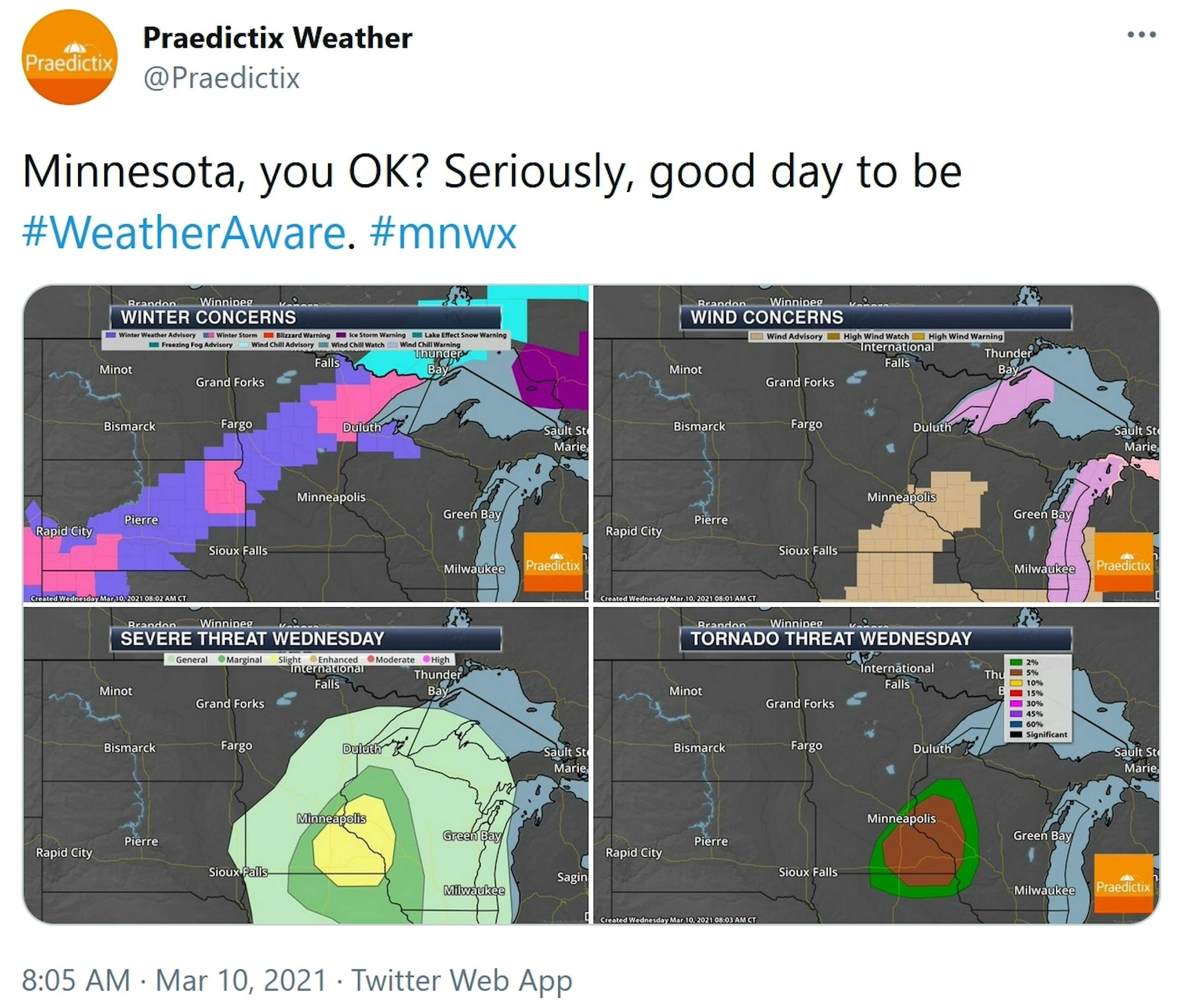 NOAA's Storm Prediction Center has a slight risk of severe storms for much of southeastern Minnesota, including a 5% tornado risk - unusual but not unprecedented for early March. There may be severe/tornado watches issued later today, so be alert for that. On the cold side of the storm a stripe of plowable accumulation is still expected for parts of central and northeastern Minnesota