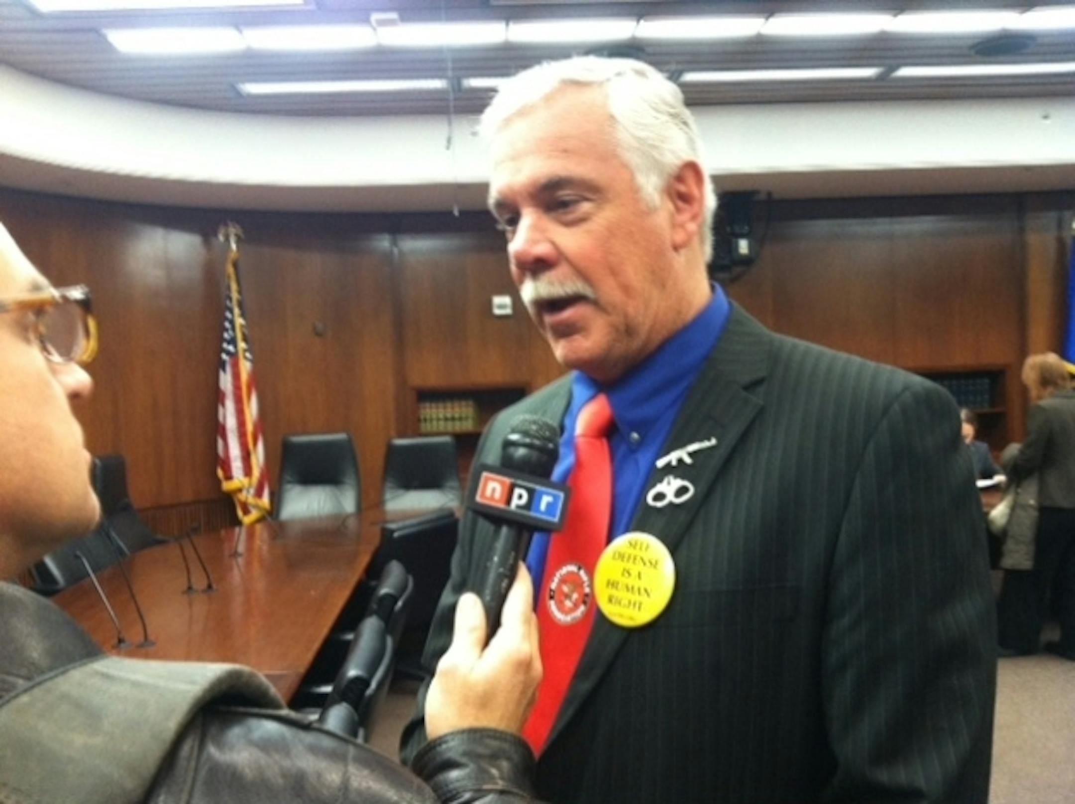 Committee member Rep. Tony Cornish, R-Vernon Center. who has vowed to defeat any bill that smacks of gun-control, wore a lapel pin of an assault weapon and a flaming scarlet NRA tie.
