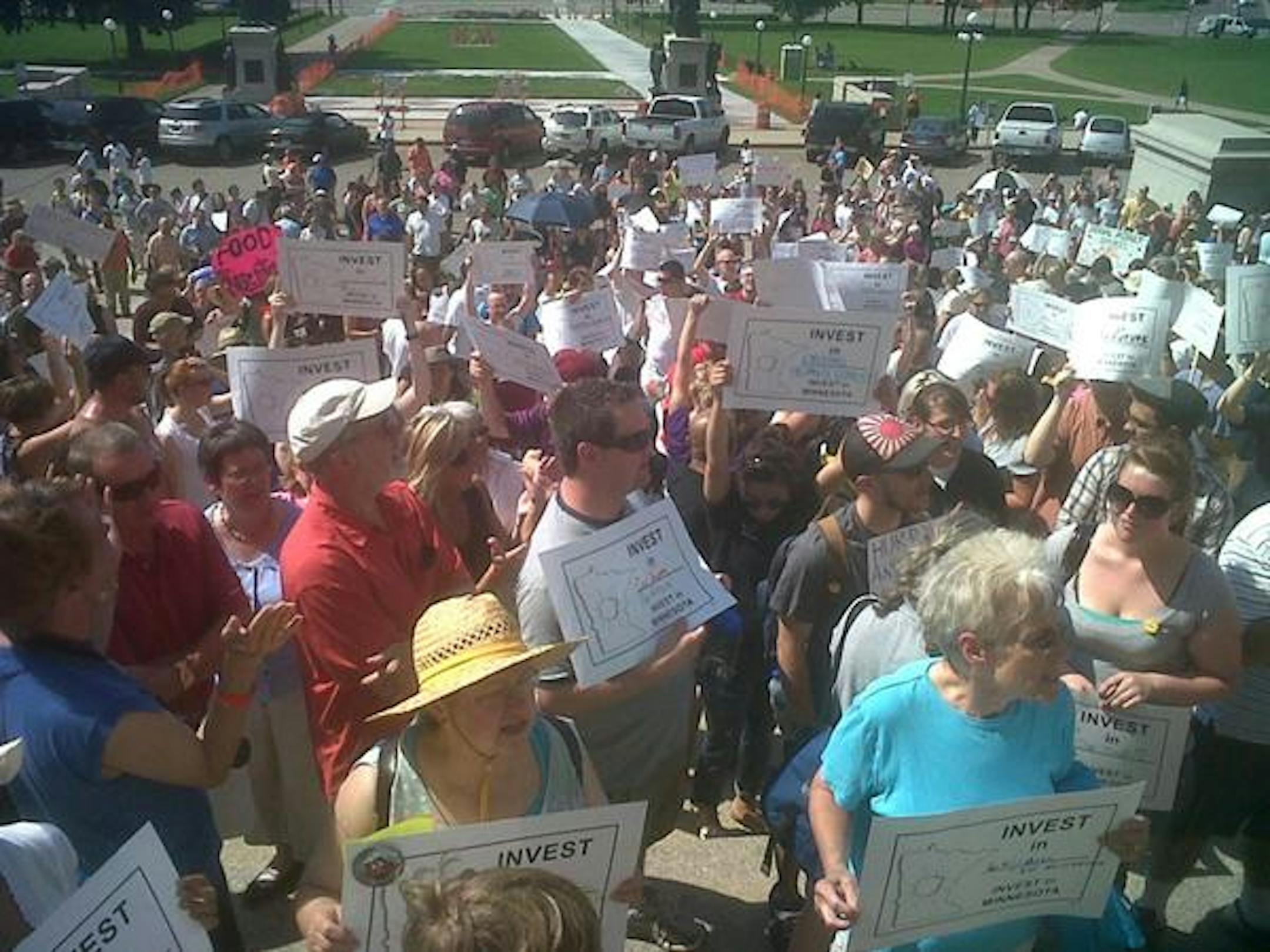 "This possible shutdown is the symptom of a big gaping hole in our state," Brian Rusche with the Joint Religious Legislative Coalition told several hundred people on the Capitol steps. "And that's the lack of revenue raised fairly that we need to achieve a humane and just and balanced approach to our budget."