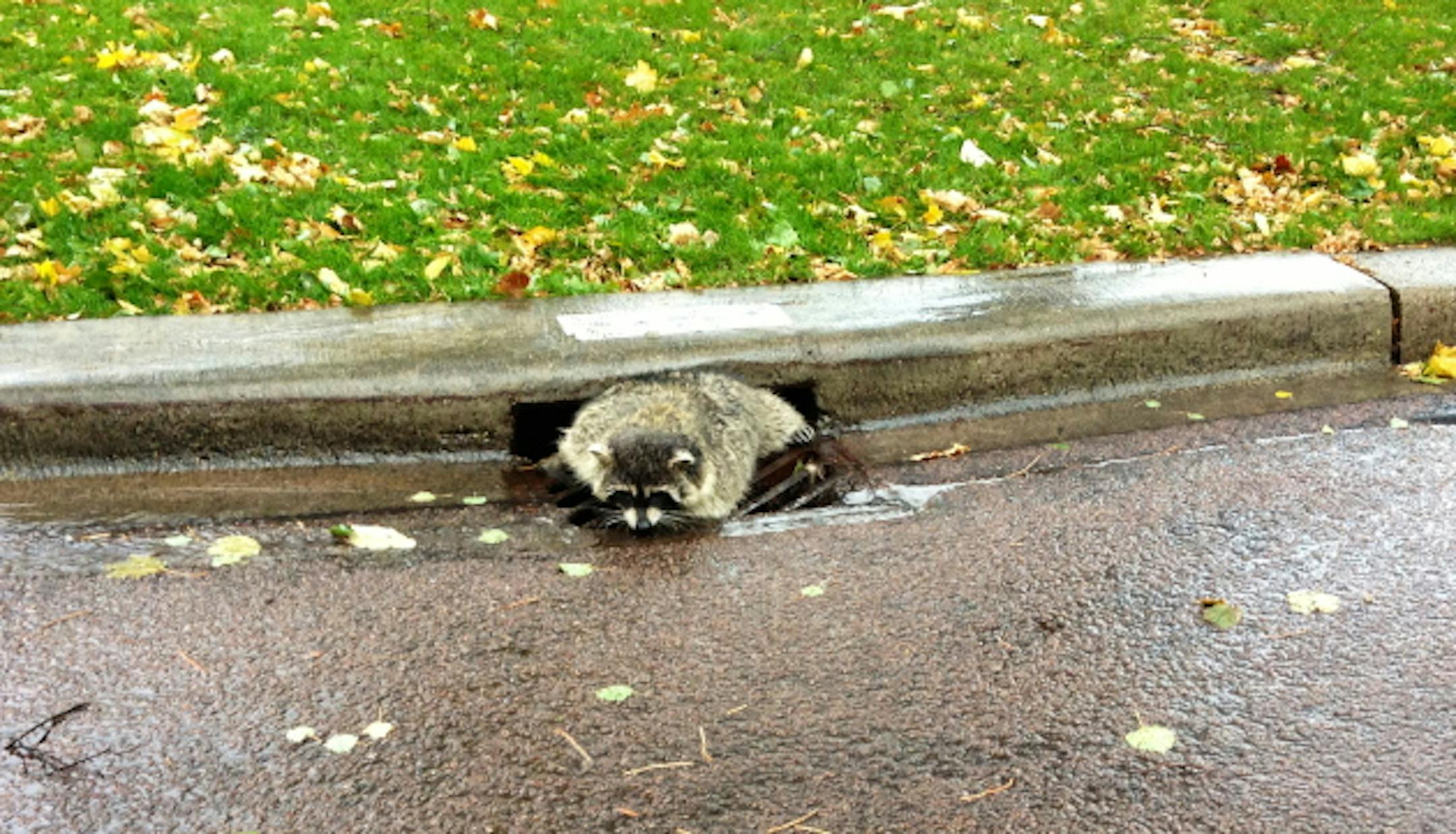 So when I noticed the pointy ears and black-masked eyes at a curious angle in the gutter the other day I just groaned. What are they up to now? But as I drove closer I realized this raccoon was between a rock and a hard place.