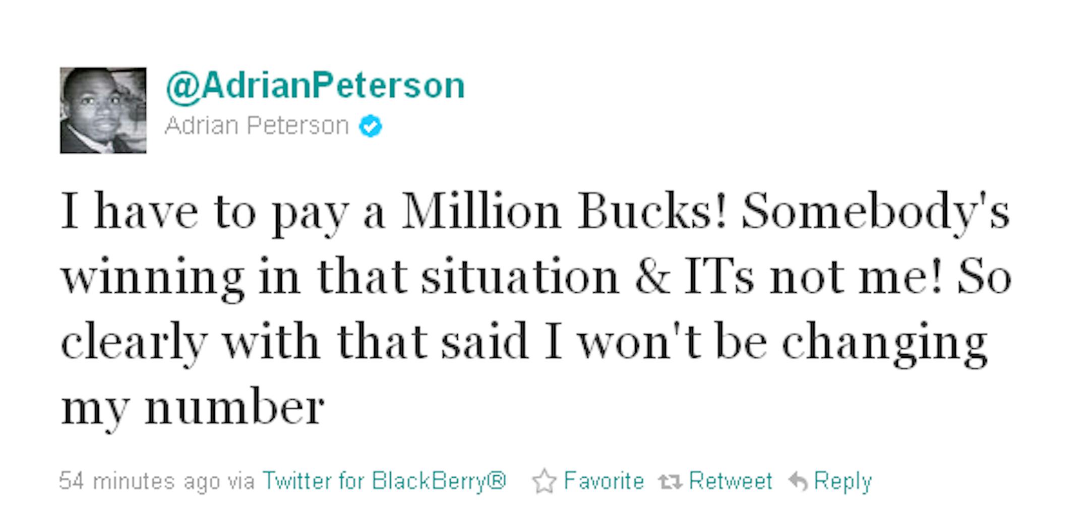 Adrian Peterson was apparently mulling a jersey number change to 23. But a series of 17 tweets today -- just picturing Adrian and his giant strong hands mashing away angrily on a Blackberry makes us chuckle -- indicates it would have cost him $1 million to do so (and that Peterson isn't happy about it). Why? Per one of those tweets: