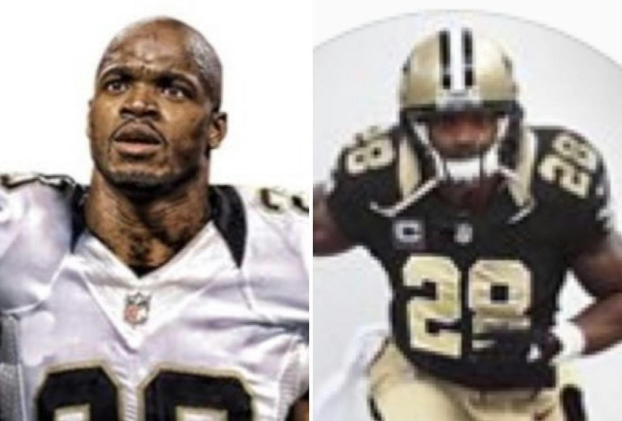The photoshopped image on Twitter features Peterson in a white Saints jersey wearing No. 28. The Instagram profile picture offers an alternate look with Peterson photoshopped into the Saints' black tops and old gold bottoms and helmet.