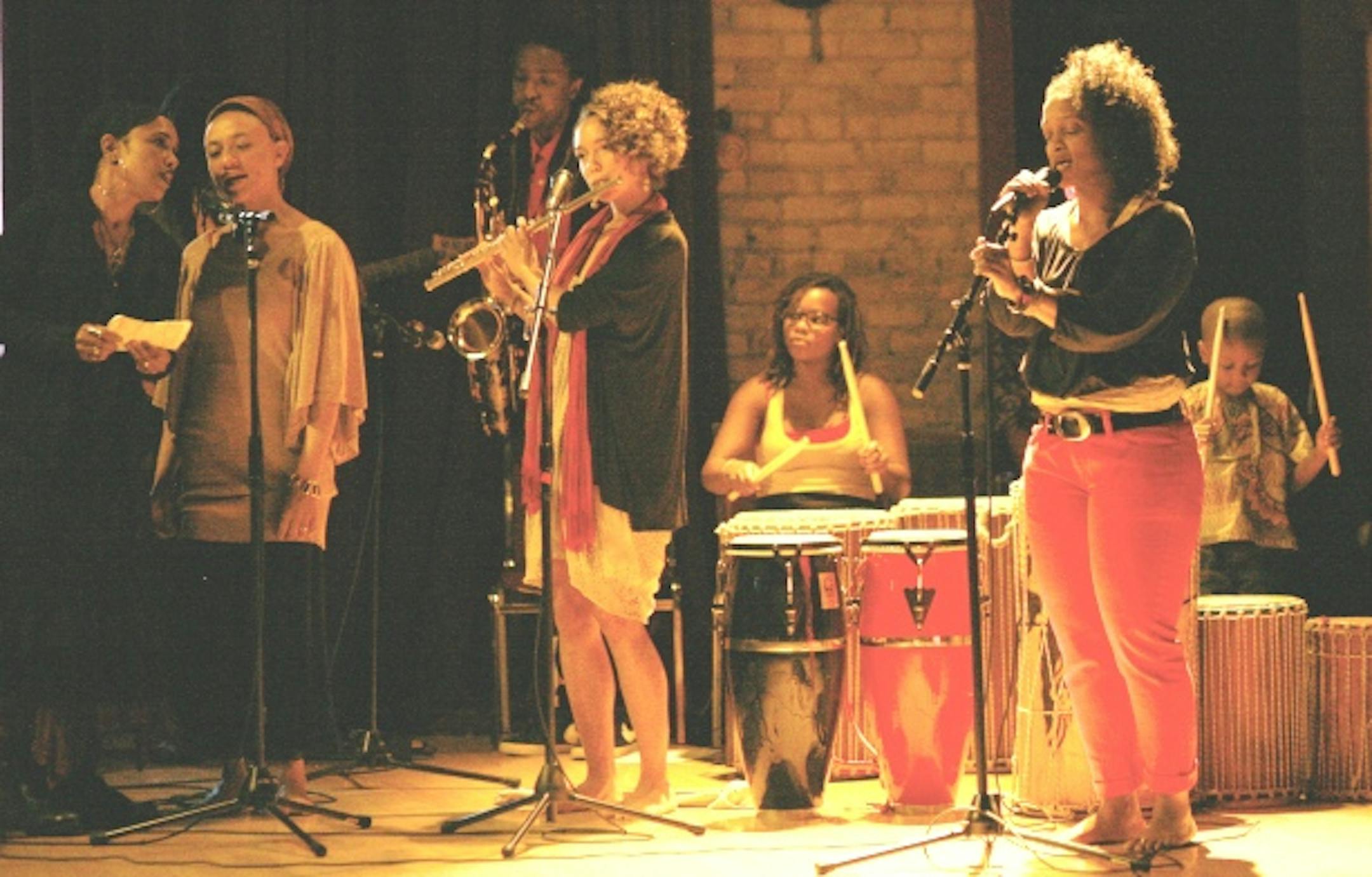"Africans in the Snow" had a celebratory vibe. Cottman has assembled a loose, and very soulful, band of musicians. They are versatile jammers, including Ayanna Muata and Leah Nelson (left), flutist Renee Copeland, and Cottman singing (right). Cottman's daughter and son are on percussion.