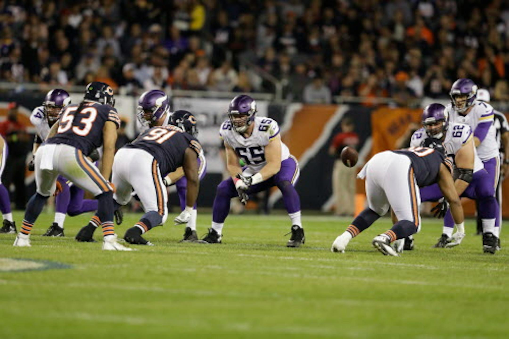 Minnesota Vikings center Pat Elflein (65) waits for a play to begin against the Chicago Bears during the second half of an NFL football game, Monday, Oct. 9, 2017, in Chicago. (AP Photo/Darron Cummings)
