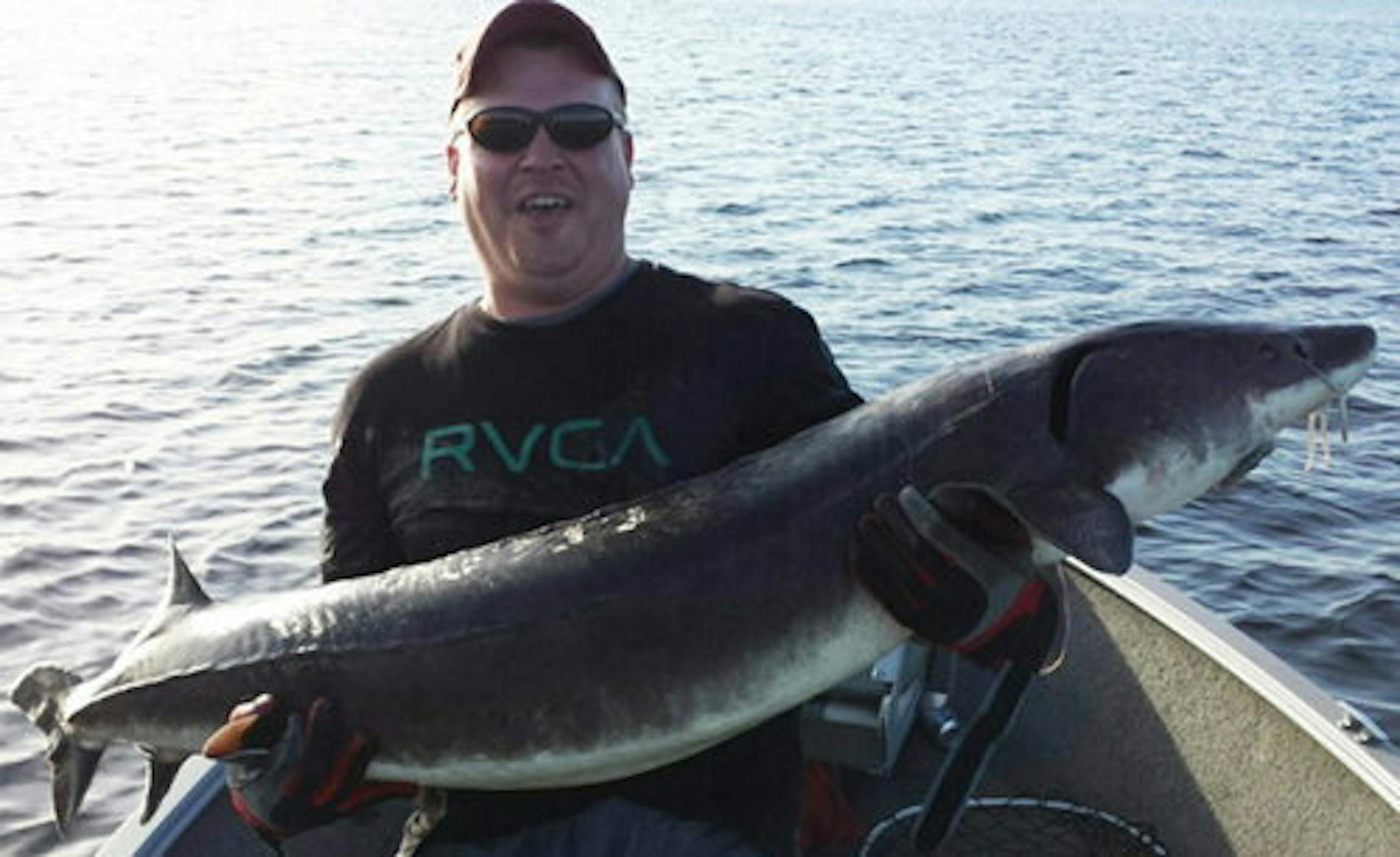 RARE CATCH: Ryan Porwall of Rockville, Minn., caught this 65-inch sturgeon in June on Lake Kabetogema. He fought the behemoth about an hour, using 8-pound test line, a hook and leech. He released the fish.