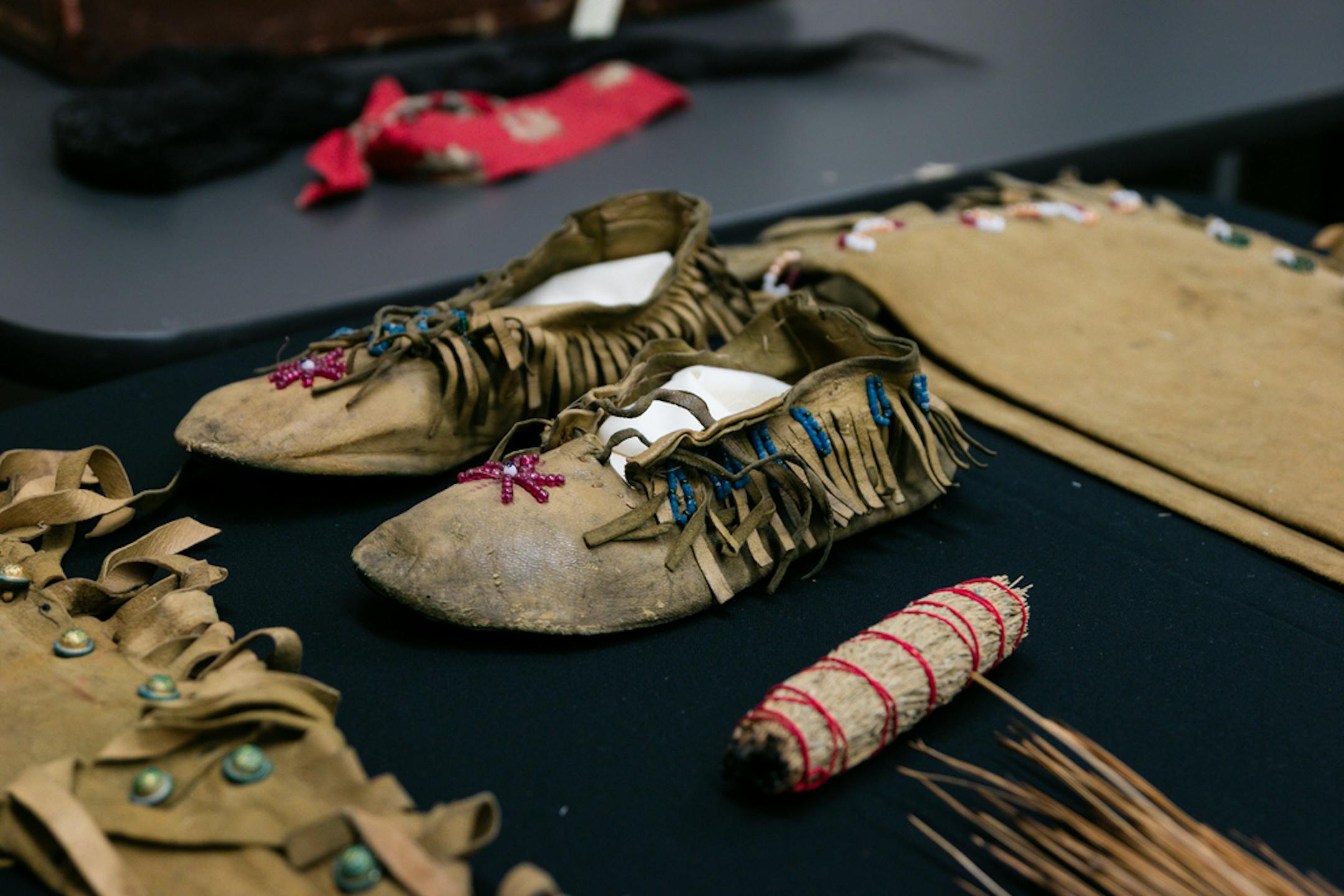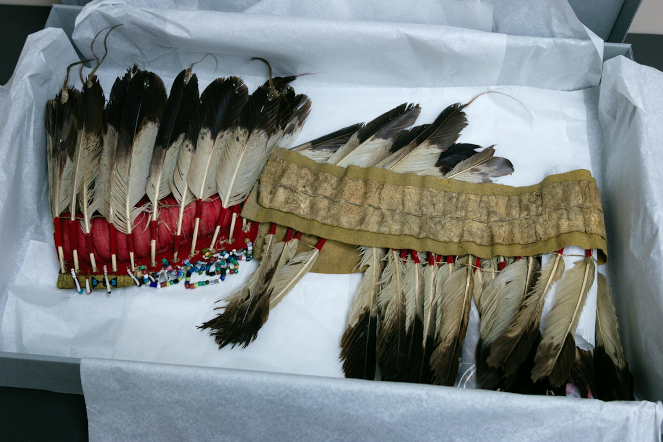 They would unlatch the metal clasps and take out a fringed shirt adorned with careful beadwork, a weathered pair of moccasins and an elaborate headdress that trailed eagle feathers down to the floor.