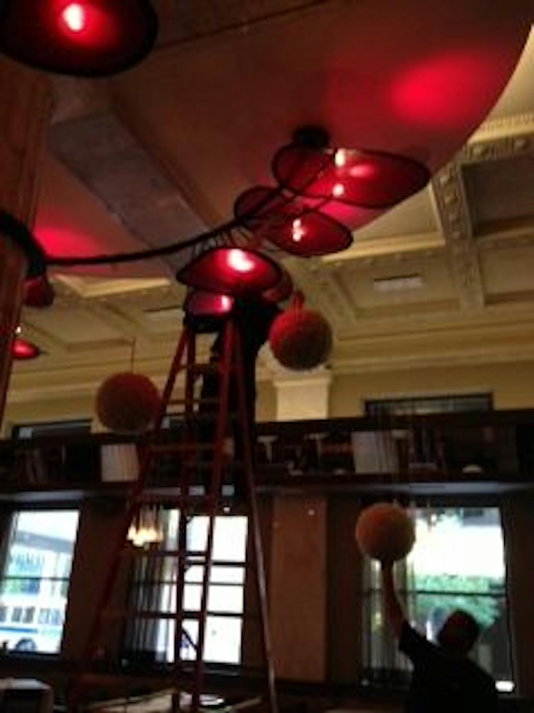 As workers from Event Lab hung the decorations, Courtney Moradipour, the hotel's catering manager, supervised the setup of the tables that will offer food, drink and desperately needed caffeine to the couples and their invited guests. For those still awake and celebrating at 5 a.m., the hotel will transition from reception to early breakfast.