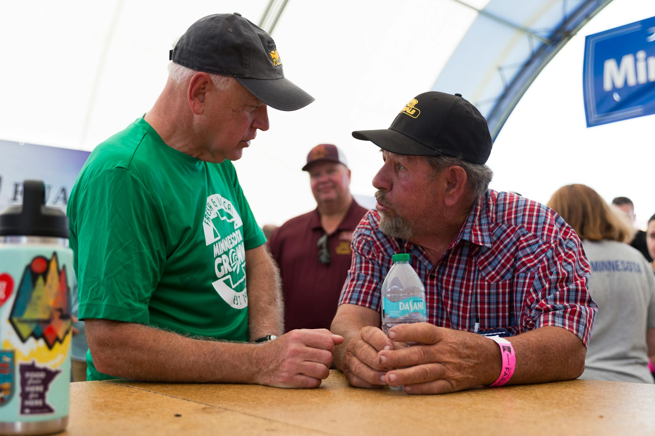 MORGAN, MINN. — Bounding between tents at an annual gathering of Minnesota’s farmers, Gov. Tim Walz talked shop with agriculture groups, munched on a pork chop on a stick and glad-handed with attendees.