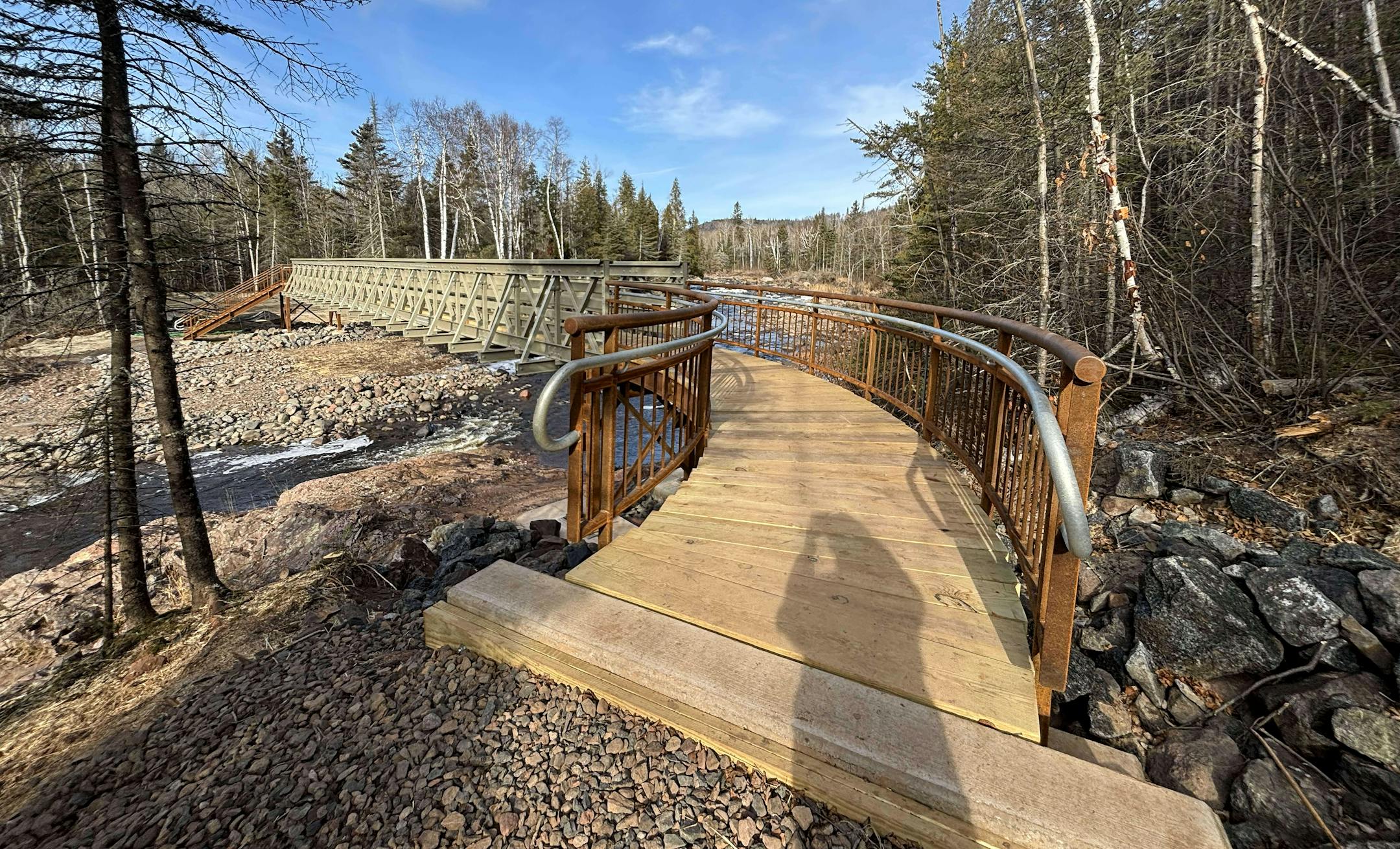 The new bridge’s unveiling also reopens the High Falls trailhead parking lot and trails to the west of the river that lead to the bridge. A group camp and nature play area also have reopened. Also, Superior Hiking Trail users no longer have a lengthy detour.