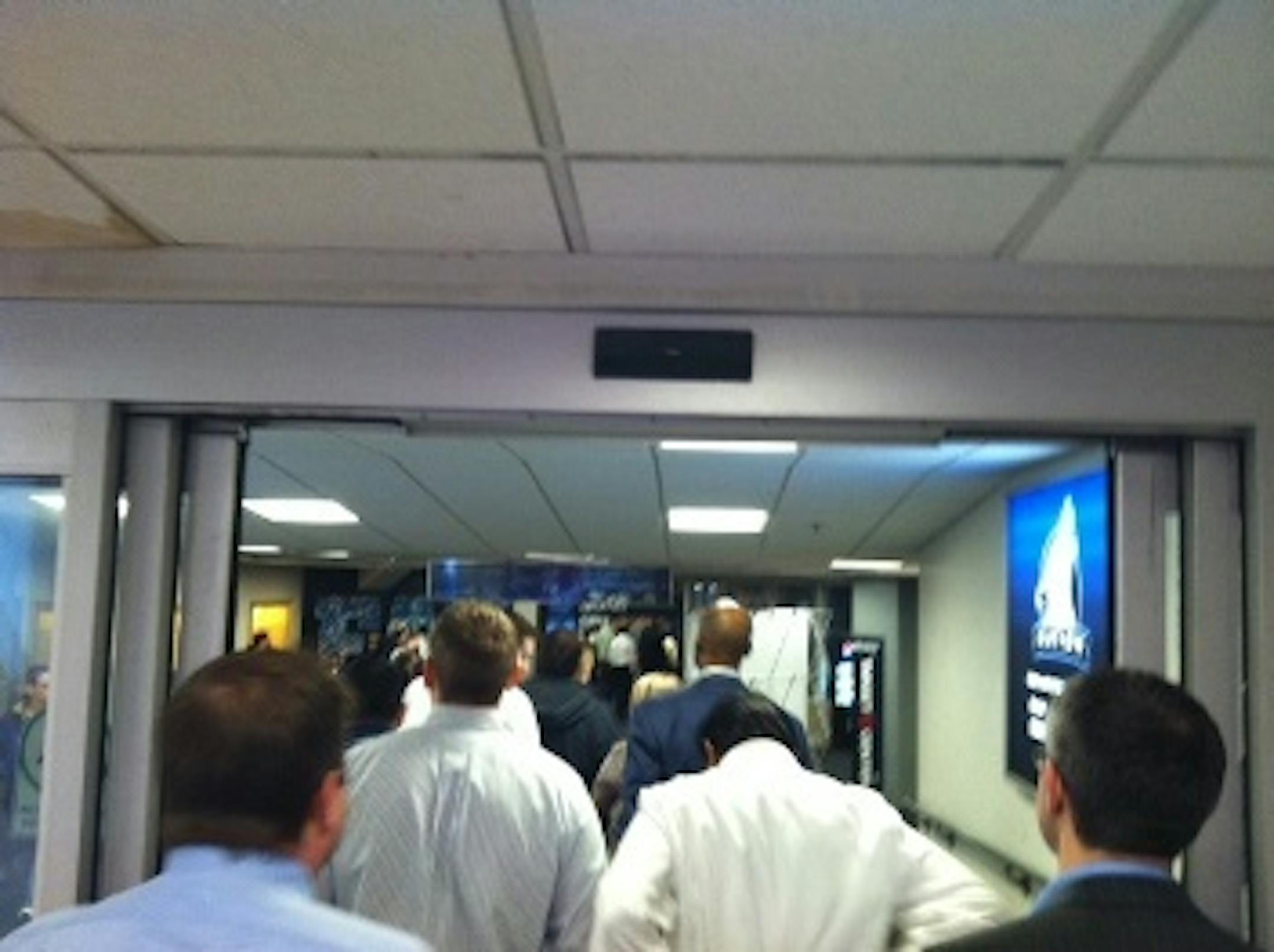 *The fan interest was pretty solid. The picture you see was the line as we waited to get through security (full pat-down, in midseason form). Sorry if any of those backs of heads were supposed to be in a meeting. We don't think anyone is incriminated, though. Once inside, it was clear there were roughly a few thousand people there -- seating was pretty much limited to one side of the lower bowl, but that was pretty much full from what we could tell. Minnesotans love free stuff, and the timing during the lunch hour was perfect, but we're still impressed by the turnout.