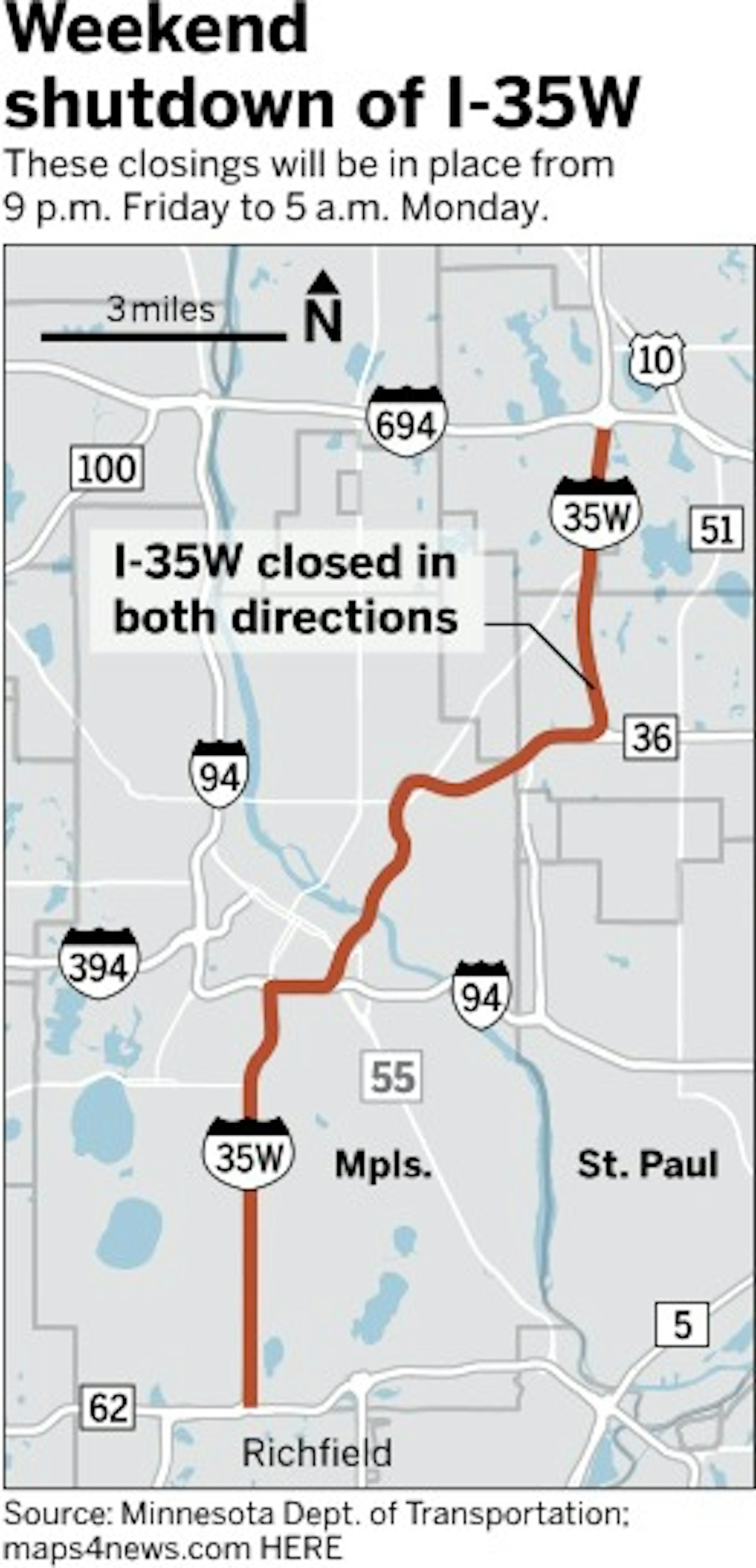 From 9 p.m. Friday to 5 a.m. Monday, northbound travel won't be allowed between the Crosstown Hwy. 62 in Richfield and Interstate 694 in Arden Hills, except for the stretch from County Road C to Interstate 694. Southbound lanes on I-35W will be closed, too, except from I-694 down to Hwy. 280 and Hwy. 36 and from 46th Street to the Crosstown.