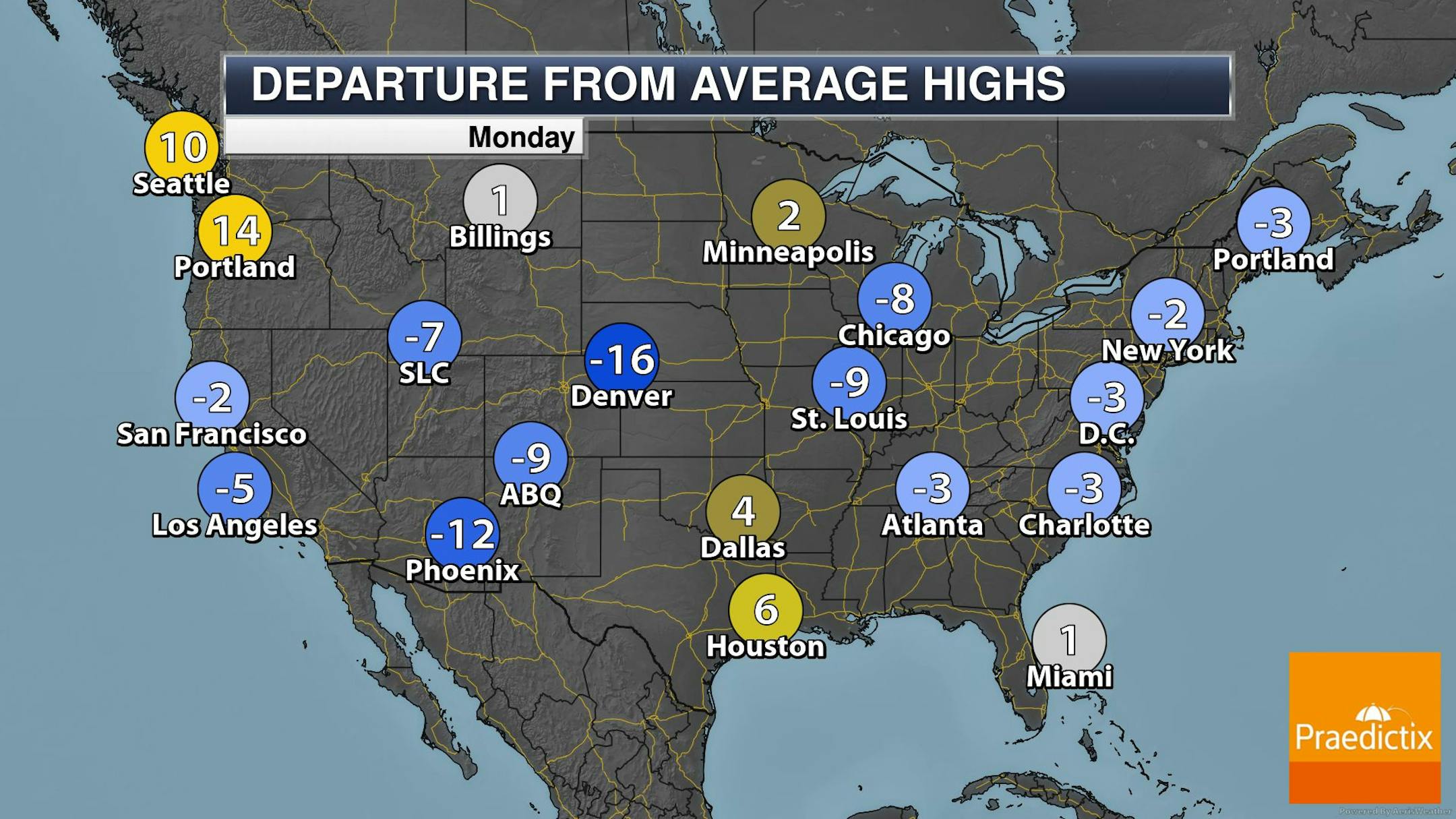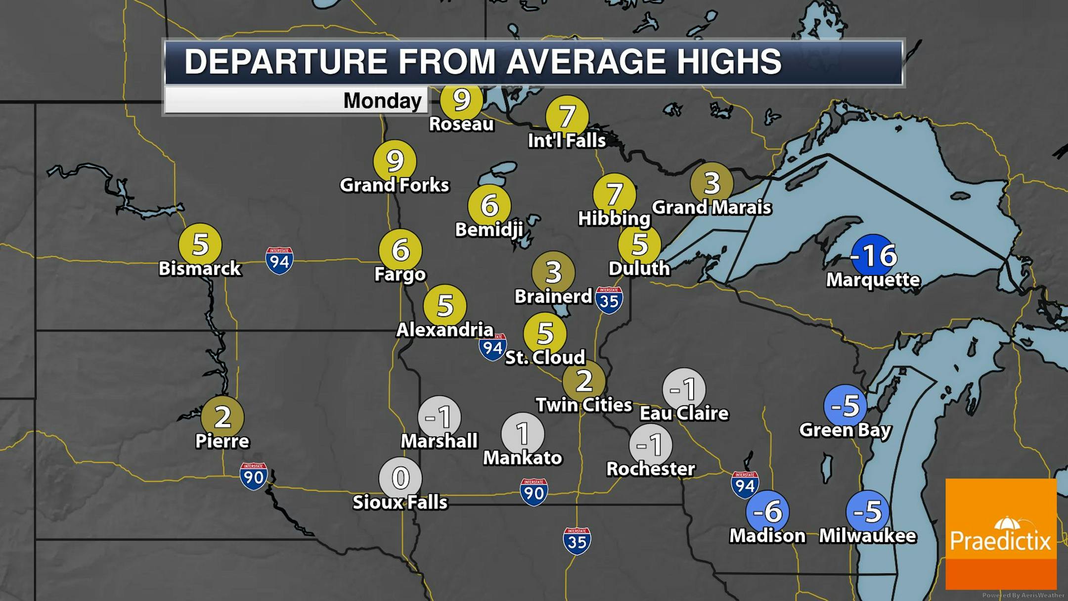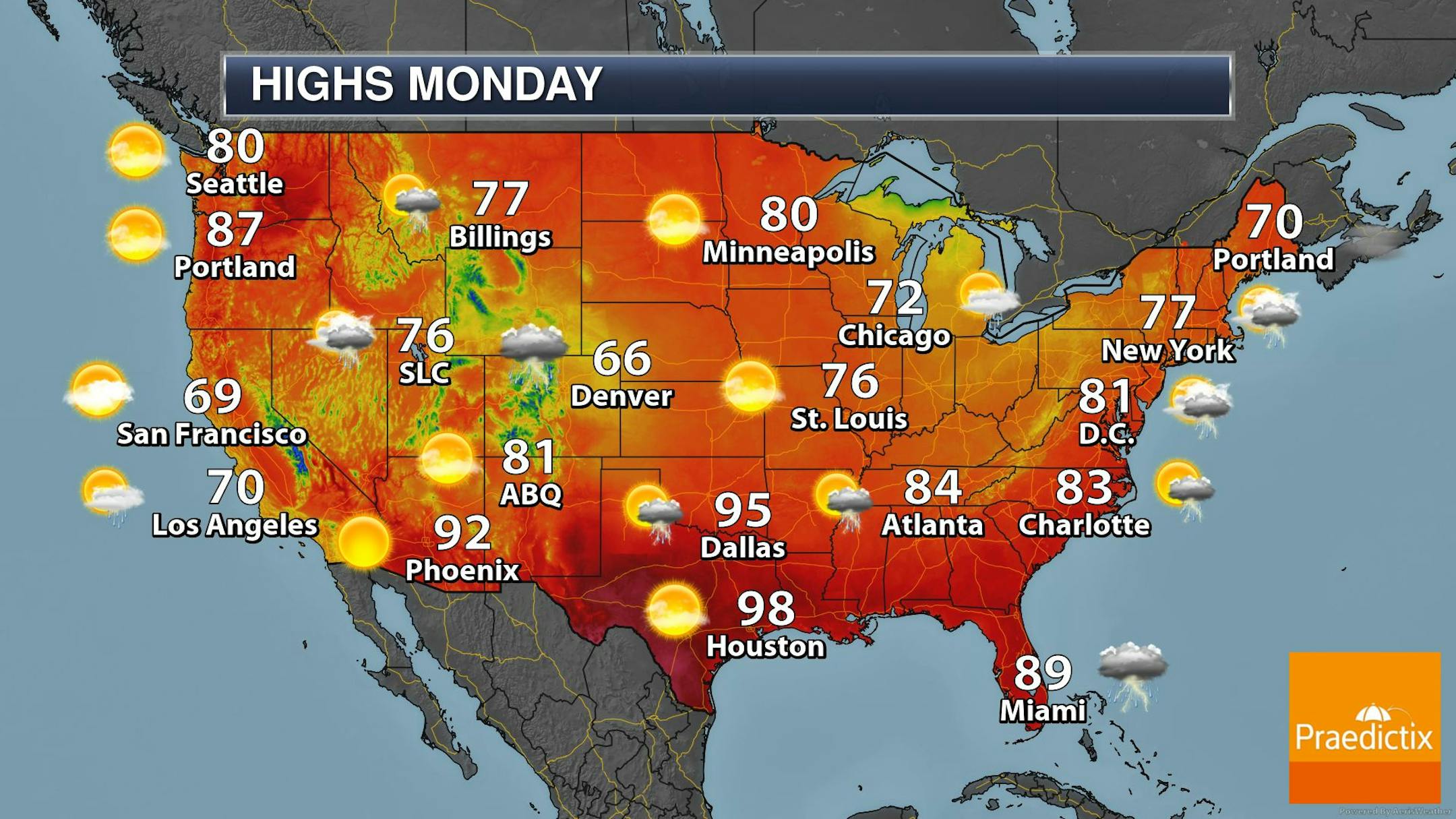 Here's the weather outlook across the region for Monday. Skies will be sunny and dry with high temps warming into the 70s and 80s across the state, which will be at or slightly above average for this time of the year.