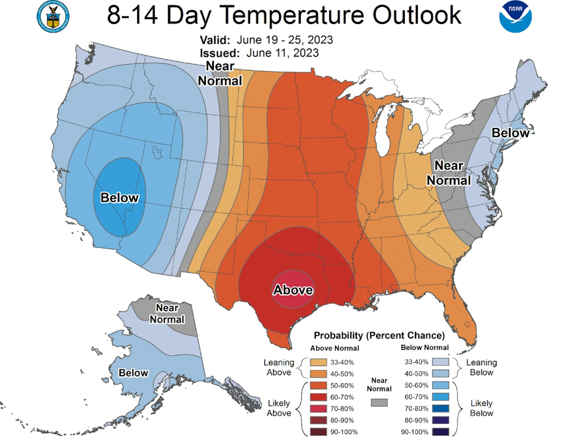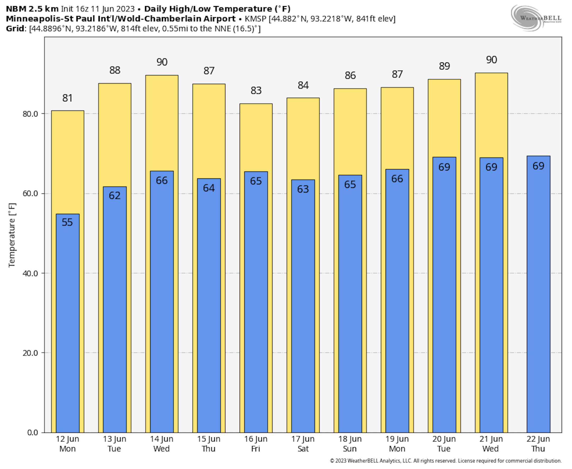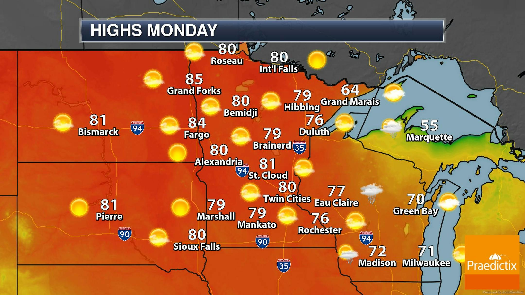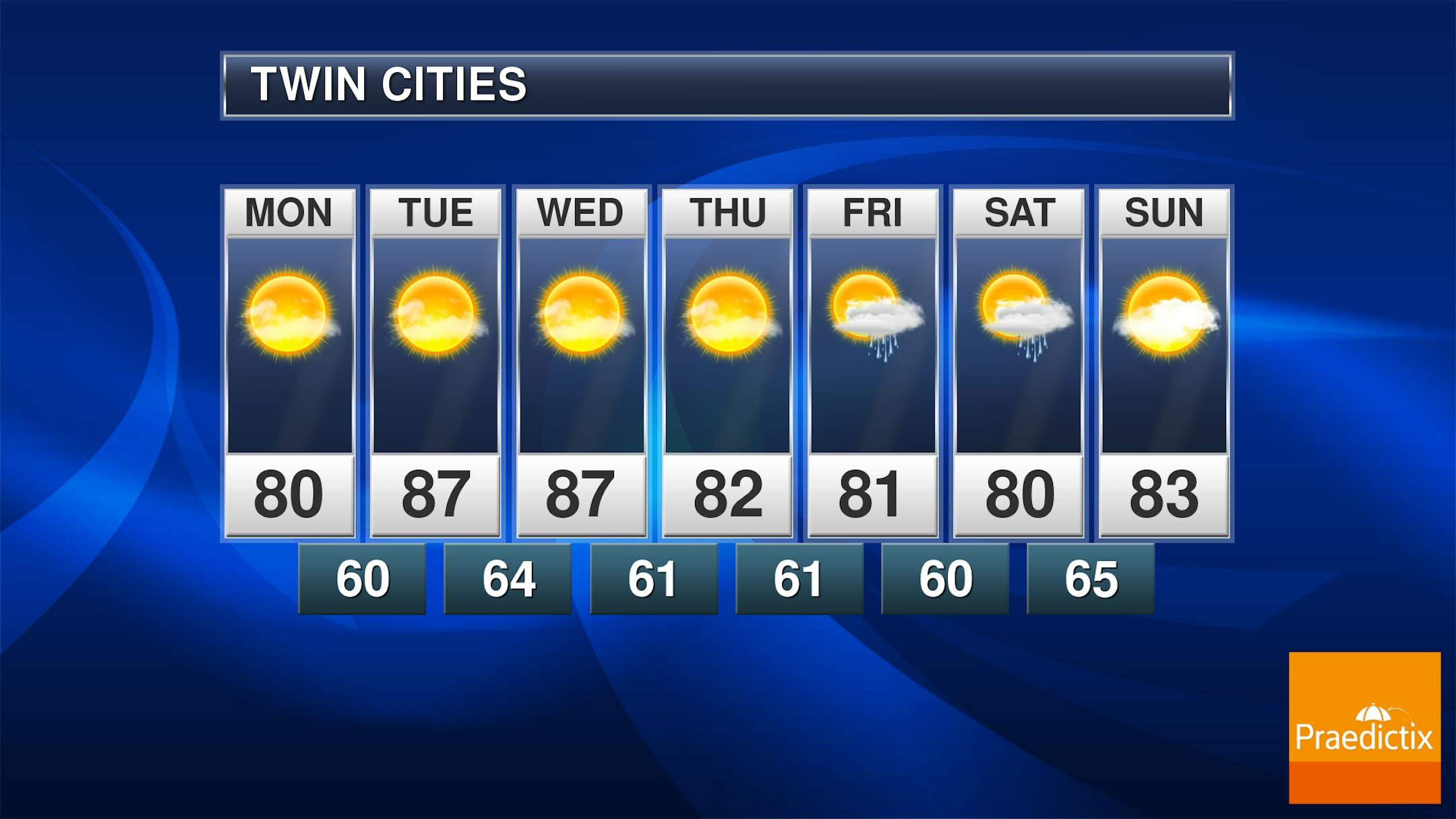 The extended weather outlook for the Twin Cities looks cooler through early next week before hotter and more humid weather returns by the middle part of next week.
