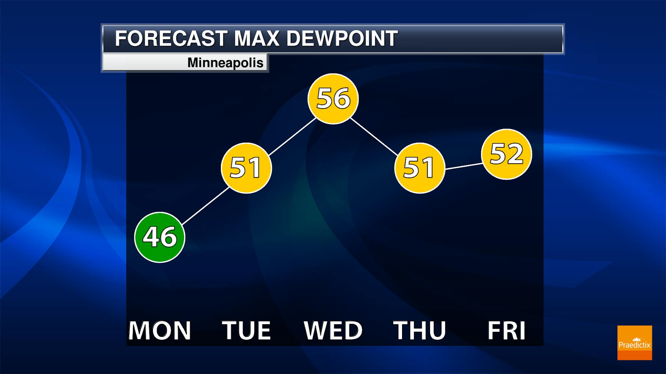 Dewpoints will still be very comfortable through the week ahead with only a slight spike on Wednesday into the mid 50s.