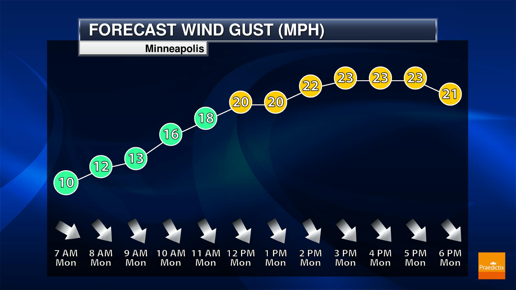 The hourly temps through the day Monday show temps starting in the mid 50s in the morning with highs warming to near 80F by the afternoon. Northwesterly winds will gust close to 20mph to 25mph through the day.