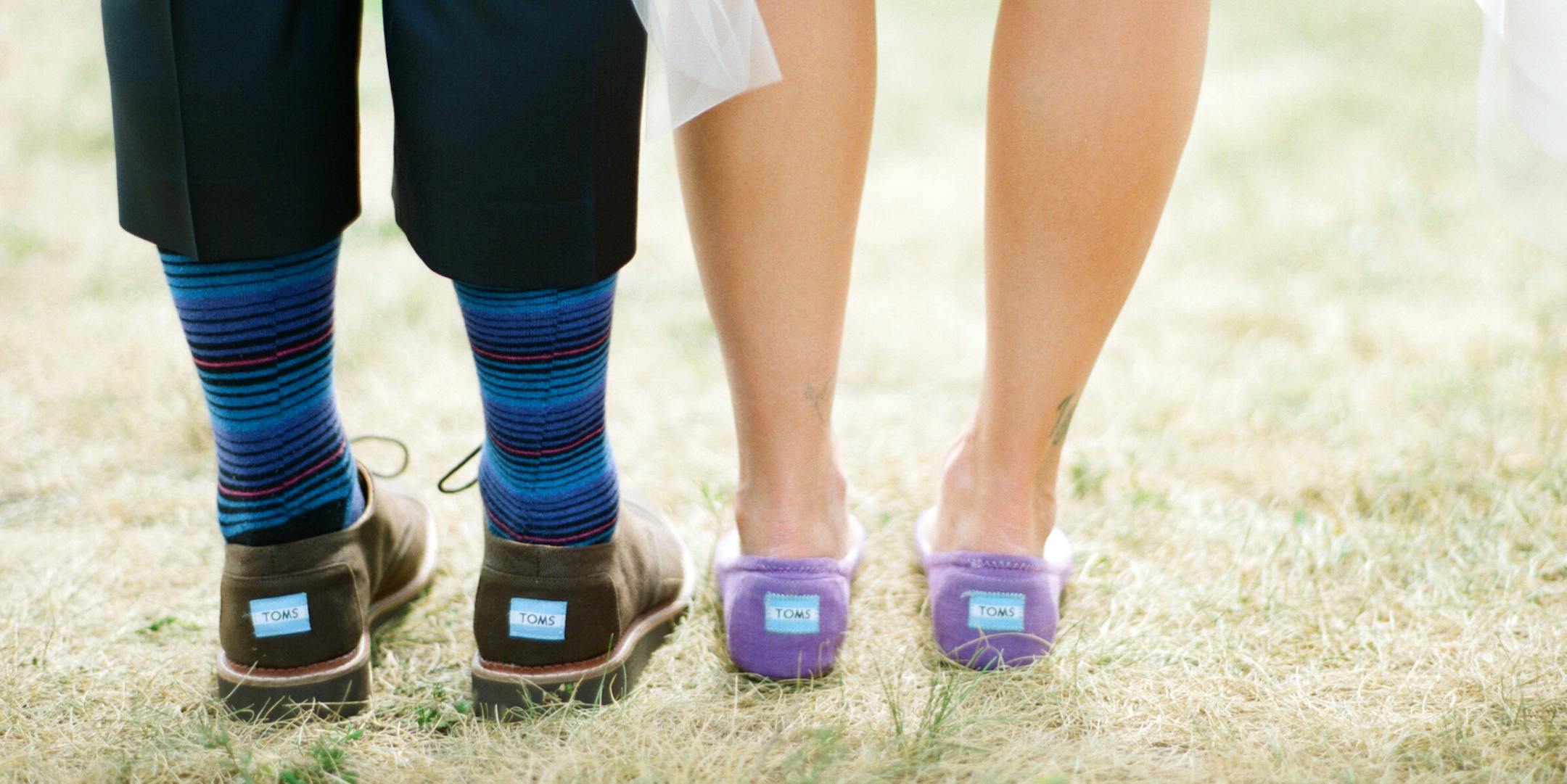 Bride's attire: Wedding dress is Blush by Hayley Paige from Che Bella in St. Paul. Earrings and hair jewelry from Che Bella. Toms purple ballet flats.