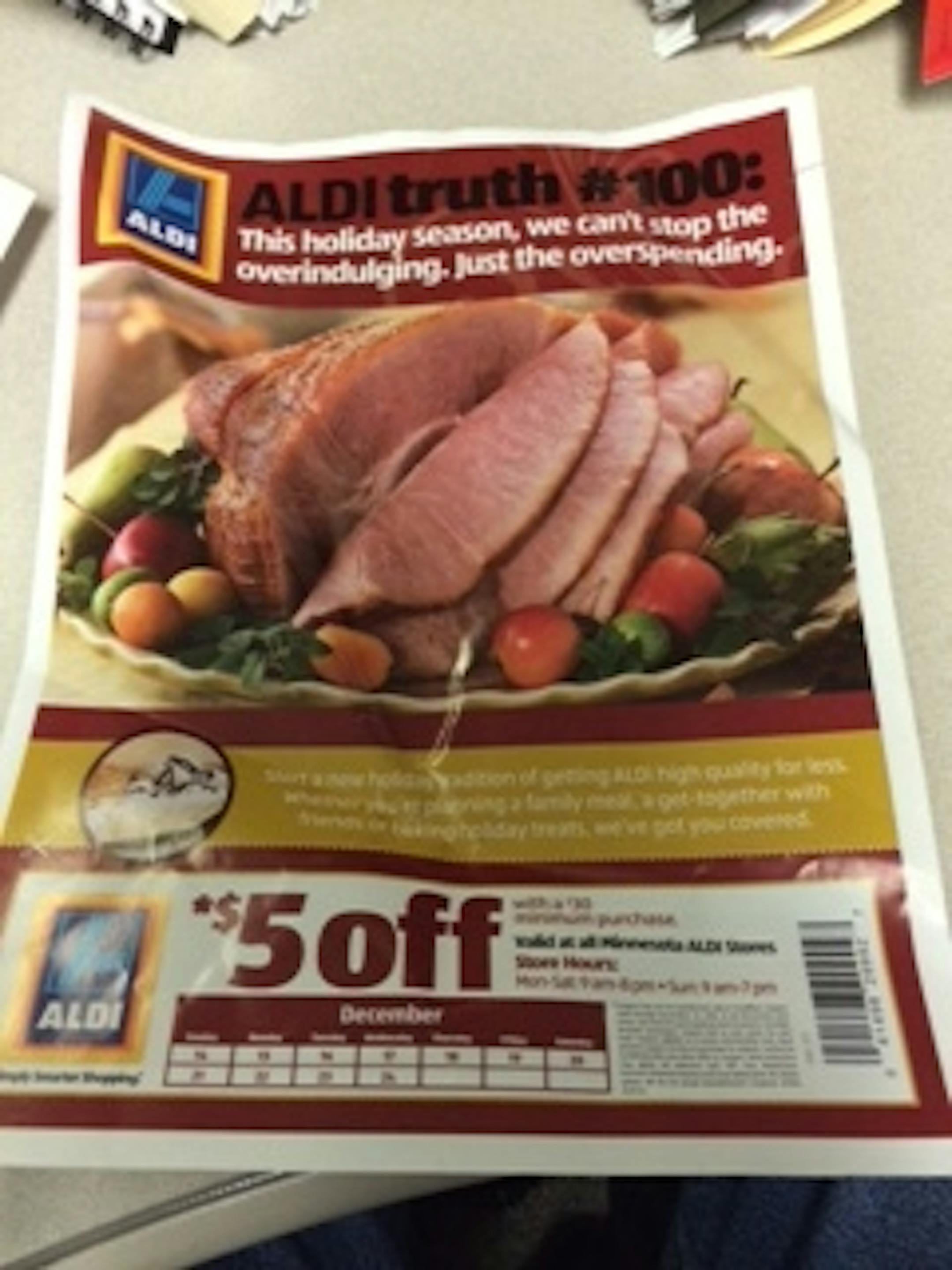 In Sunday's Star Tribune (Dec. 14), Aldi also included a single glossy sheet (shown) with a $5 off coupon off a $30 purchase. The coupon offers are a first for Aldi this year, with a similar one running around Thanksgiving."We're hoping to attract shoppers who may be looking for a new grocery store after Rainbow closed," said Lilla.
