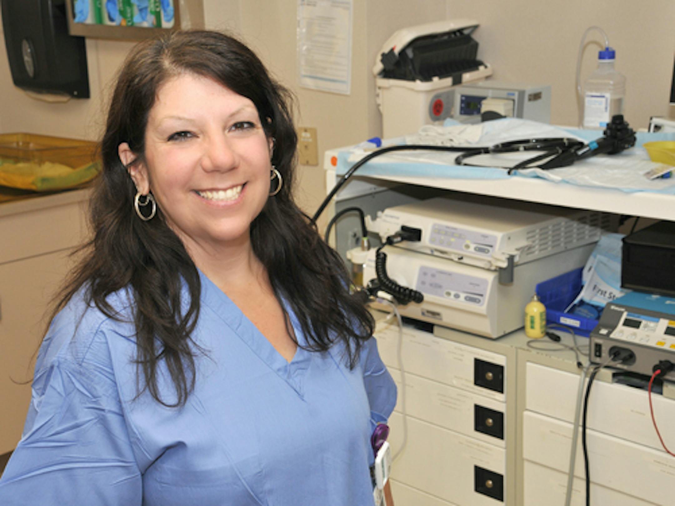 A: I work on colonoscopies, esophageal gastro duodenoscopies, endoscopic ultrasounds and endoscopic retrograde cholangio pancratographies. My day starts with setting up and stocking the treatment rooms with supplies for these procedures. We have four regular procedure rooms, an ultrasound room and a room in the OR for procedures that need to be done under general anesthesia. I can work on five procedures a day. During the procedure, I assist the physician with biopsies or snares to remove the polyps, and with banding of the esophagus in case of bleeding. Once each procedure is done, I clean the scopes, remove the dirty linens, clean the room and set up for the next patient.