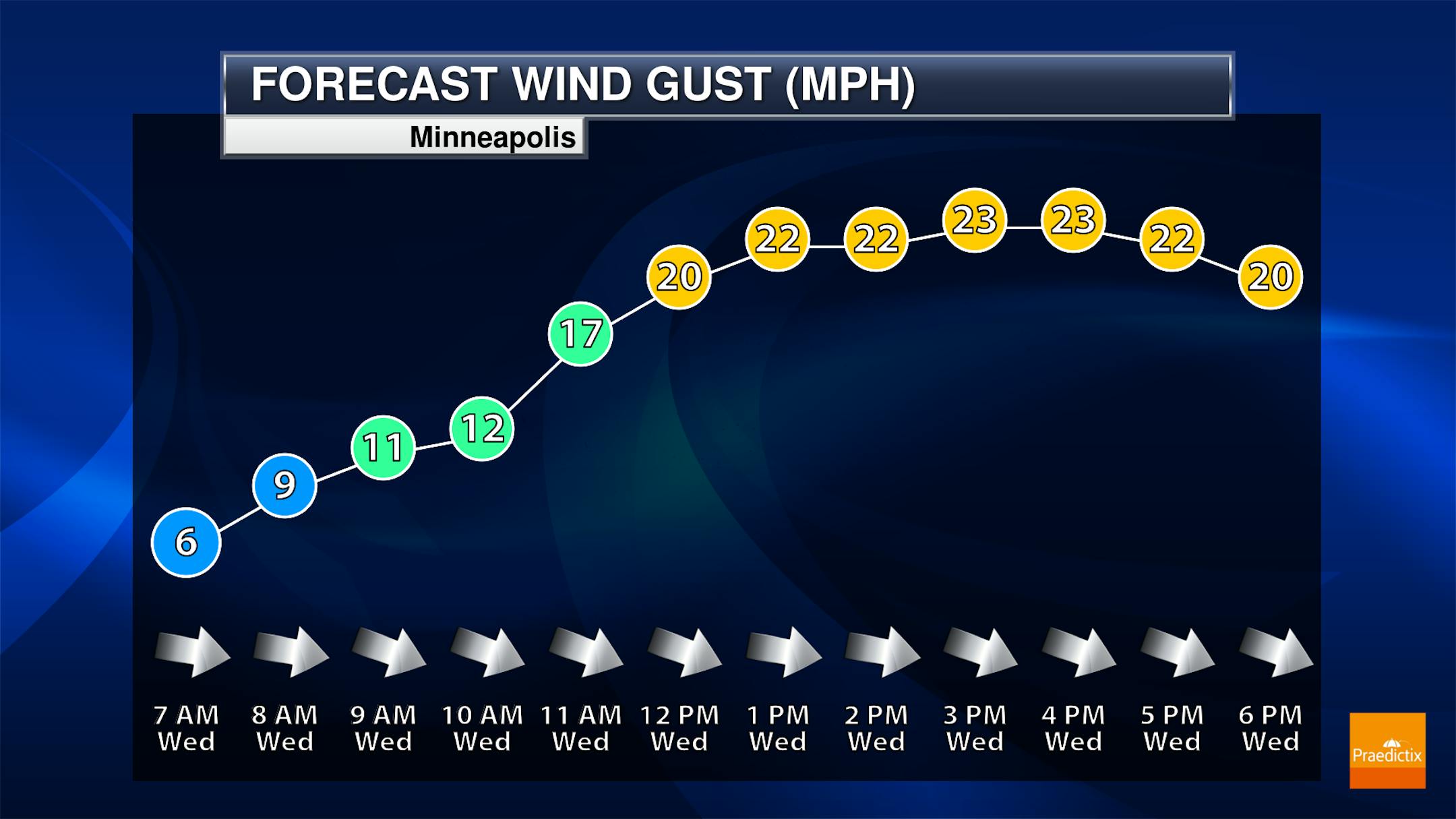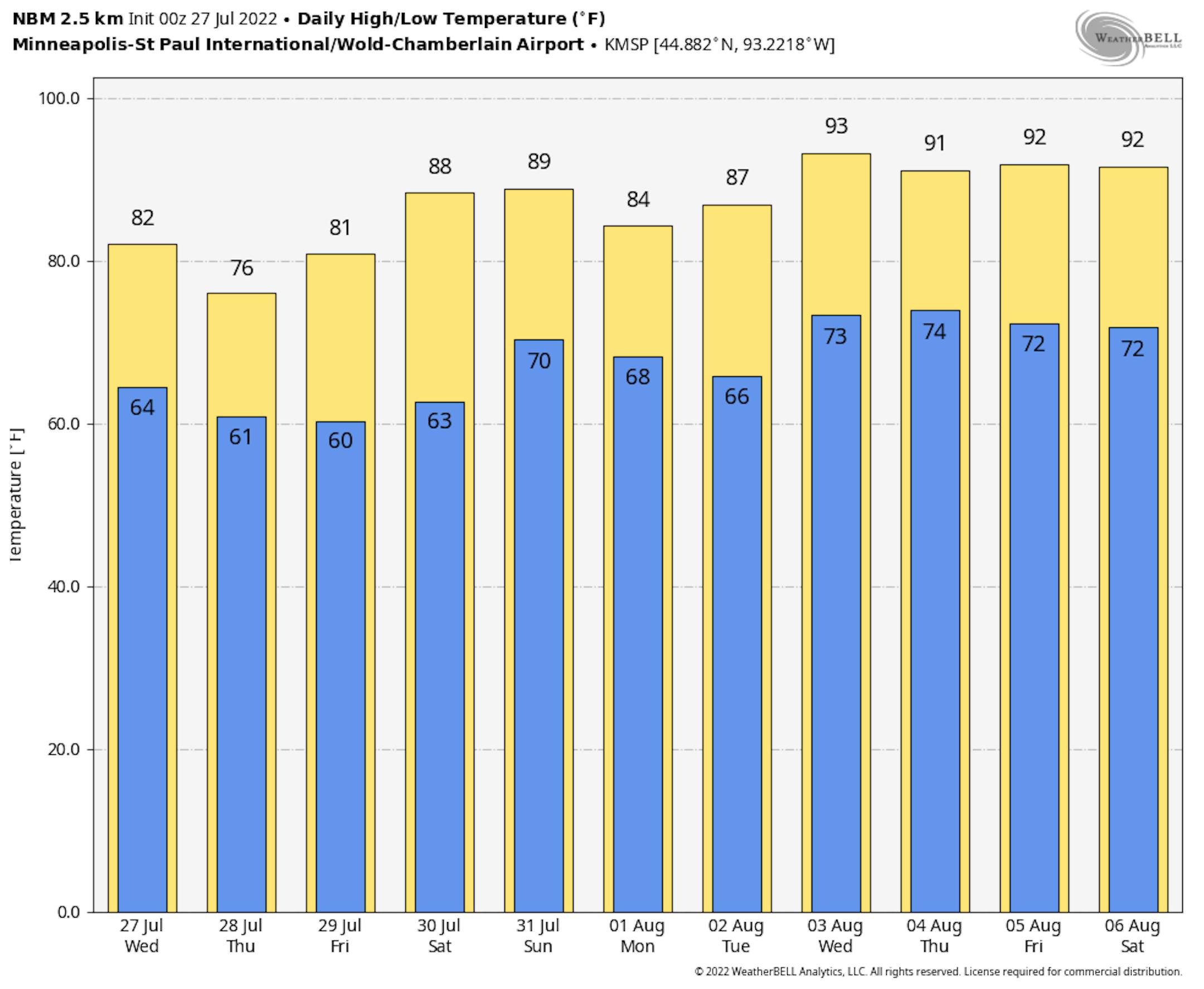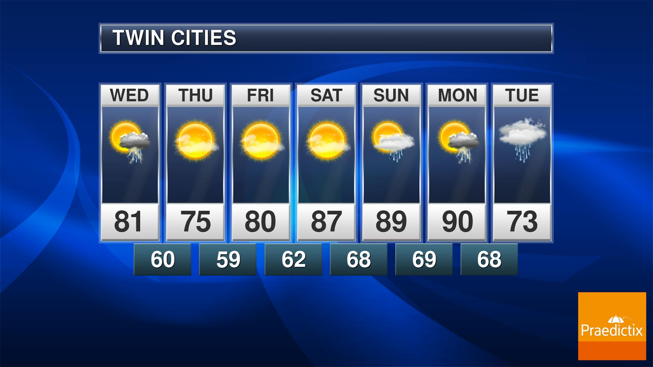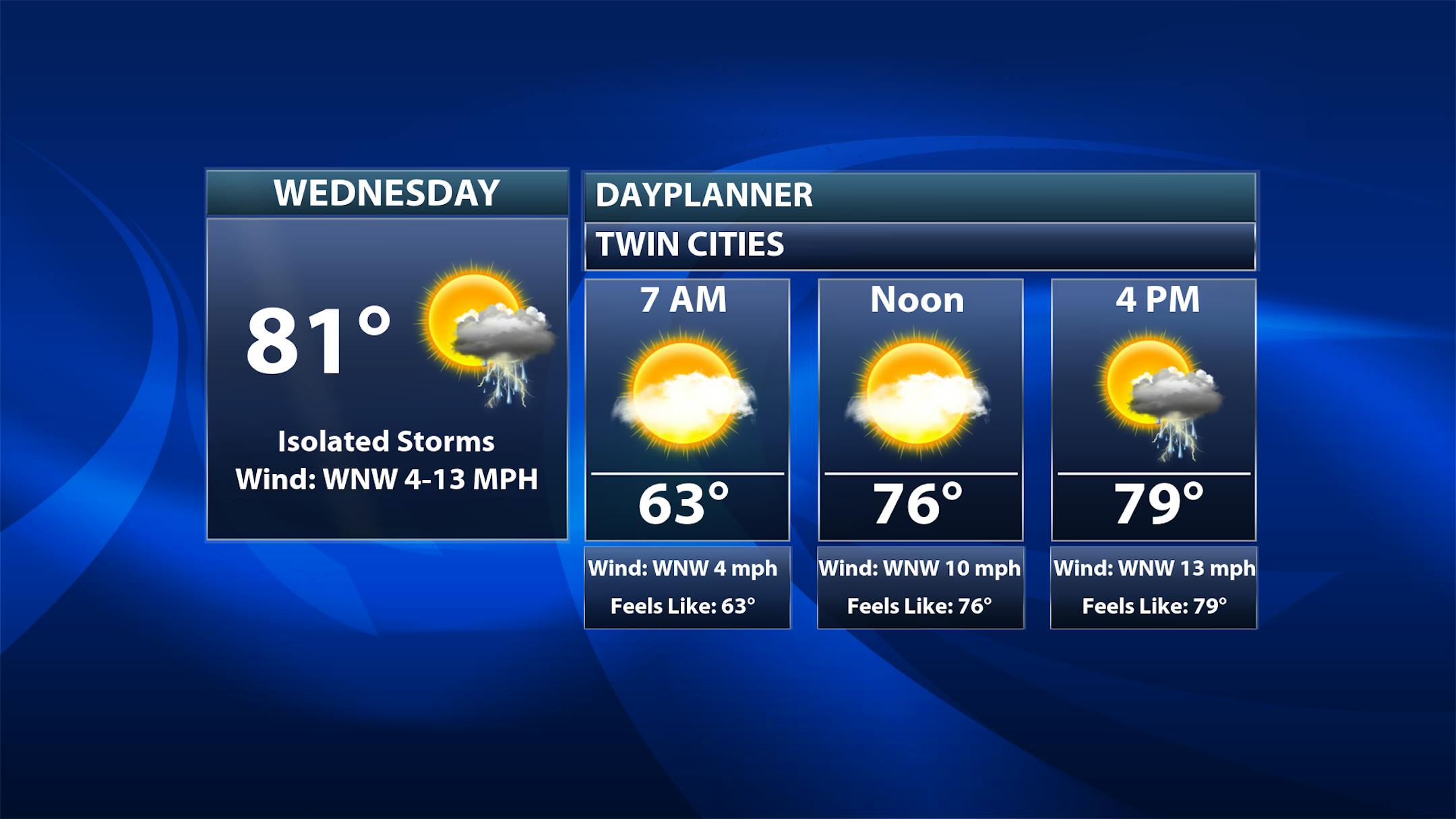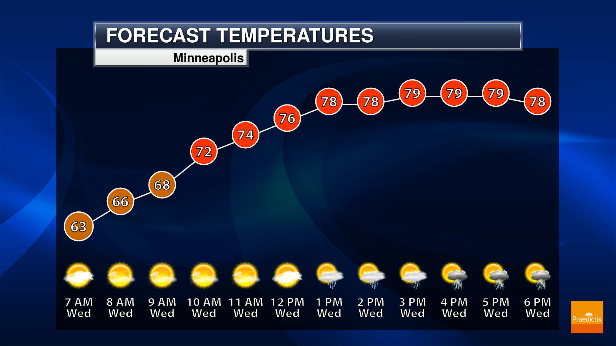 The weather outlook for Minneapolis on Wednesday shows temps warming to near 80F with spotty showers and storms possible. It won't be a complete washout but there will be random t-showers possible through the PM hours.
