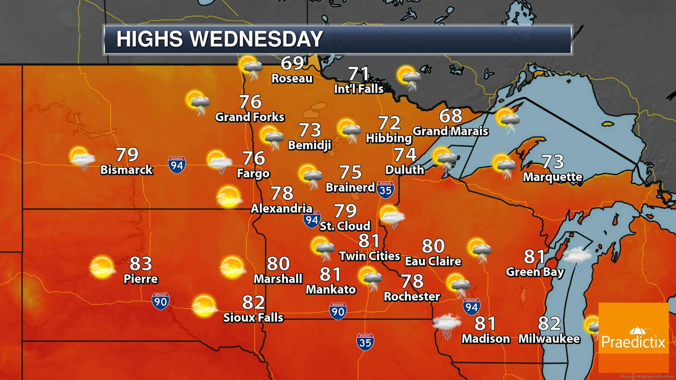 The weather outlook for Wednesday shows temps warming into the 70s & 80s across the region with some locations in the Arrowhead only warming into the 60s. Note that these readings will generally be below average for late July. There will also be isolated showers and storms popping up through the day as well.