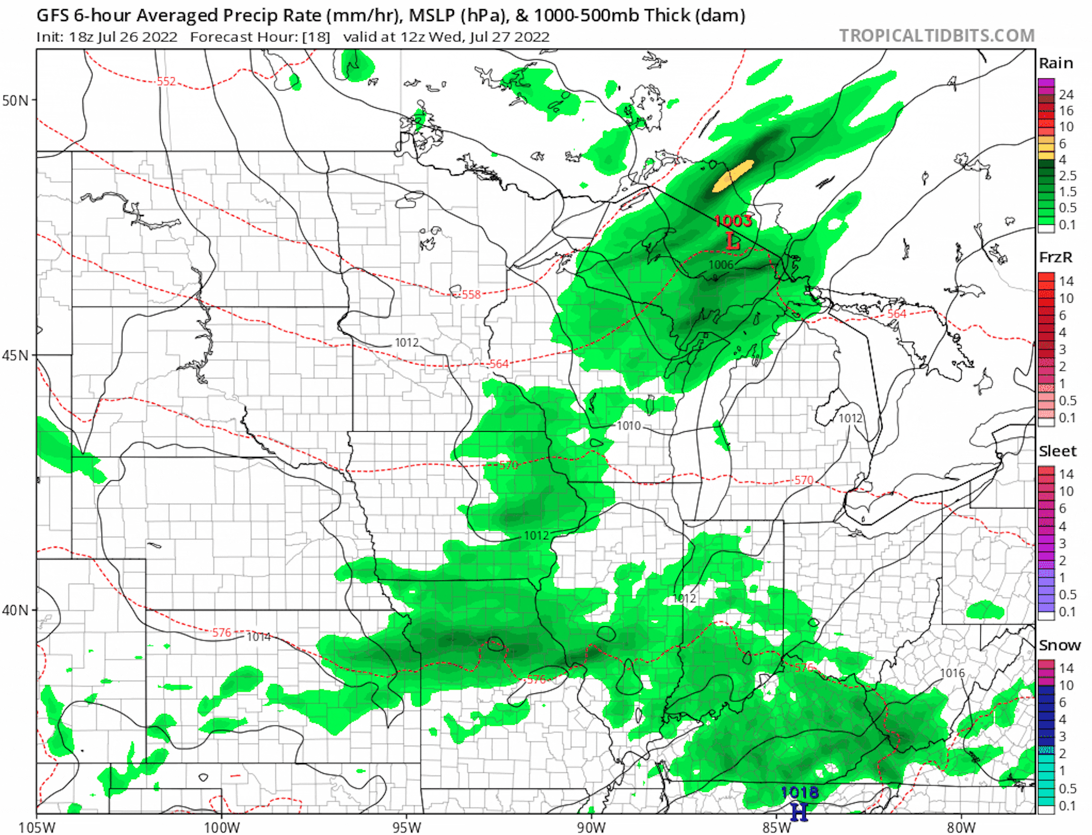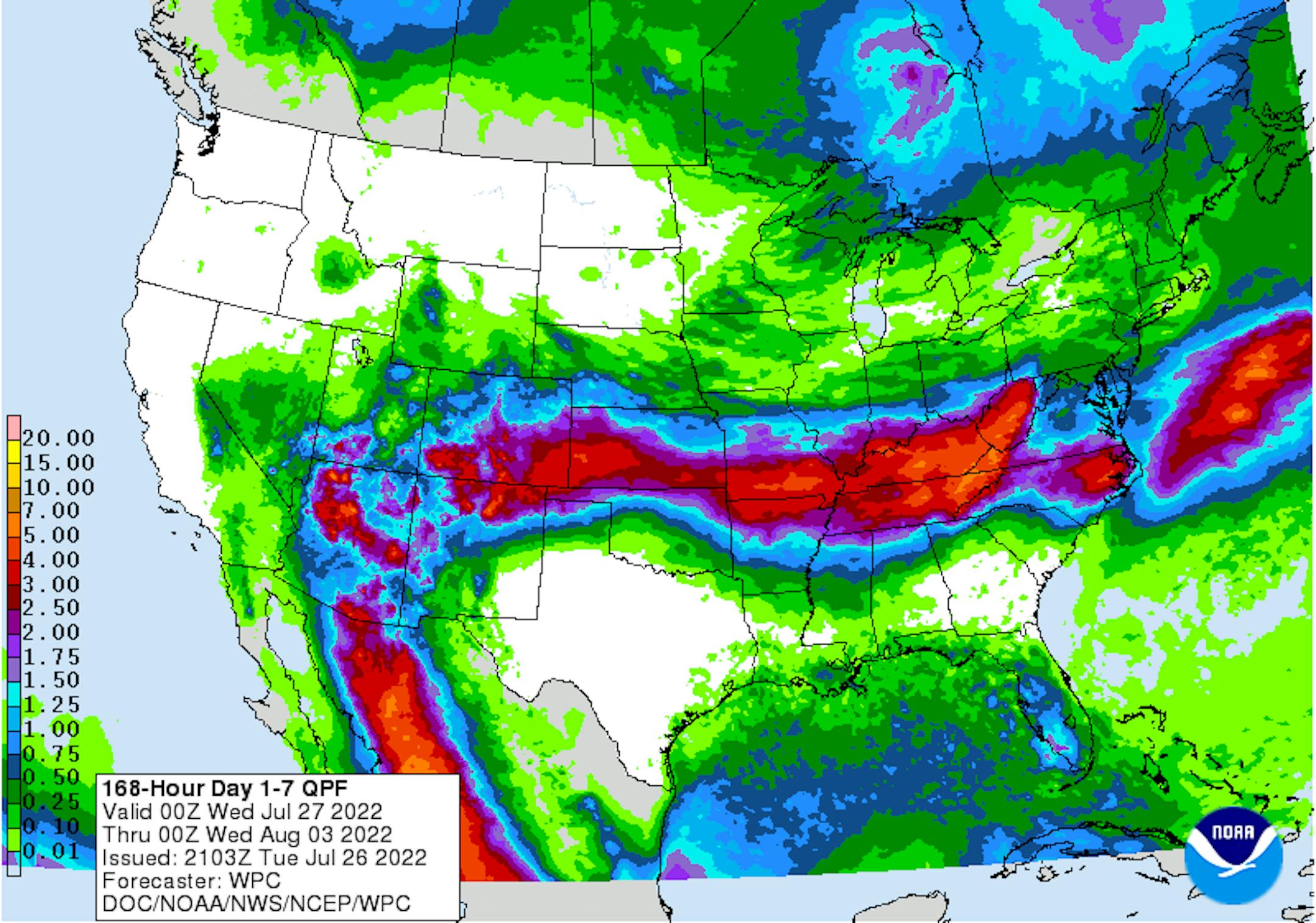 Here's the weather outlook from AM Wednesday to AM Tuesday. After a few storms on Tuesday, there doesn't appear to be much in terms of heavy rain chances through the rest of the week. There may be a late day storm threat on Sunday into early Monday with summertime heat returning into early August.
