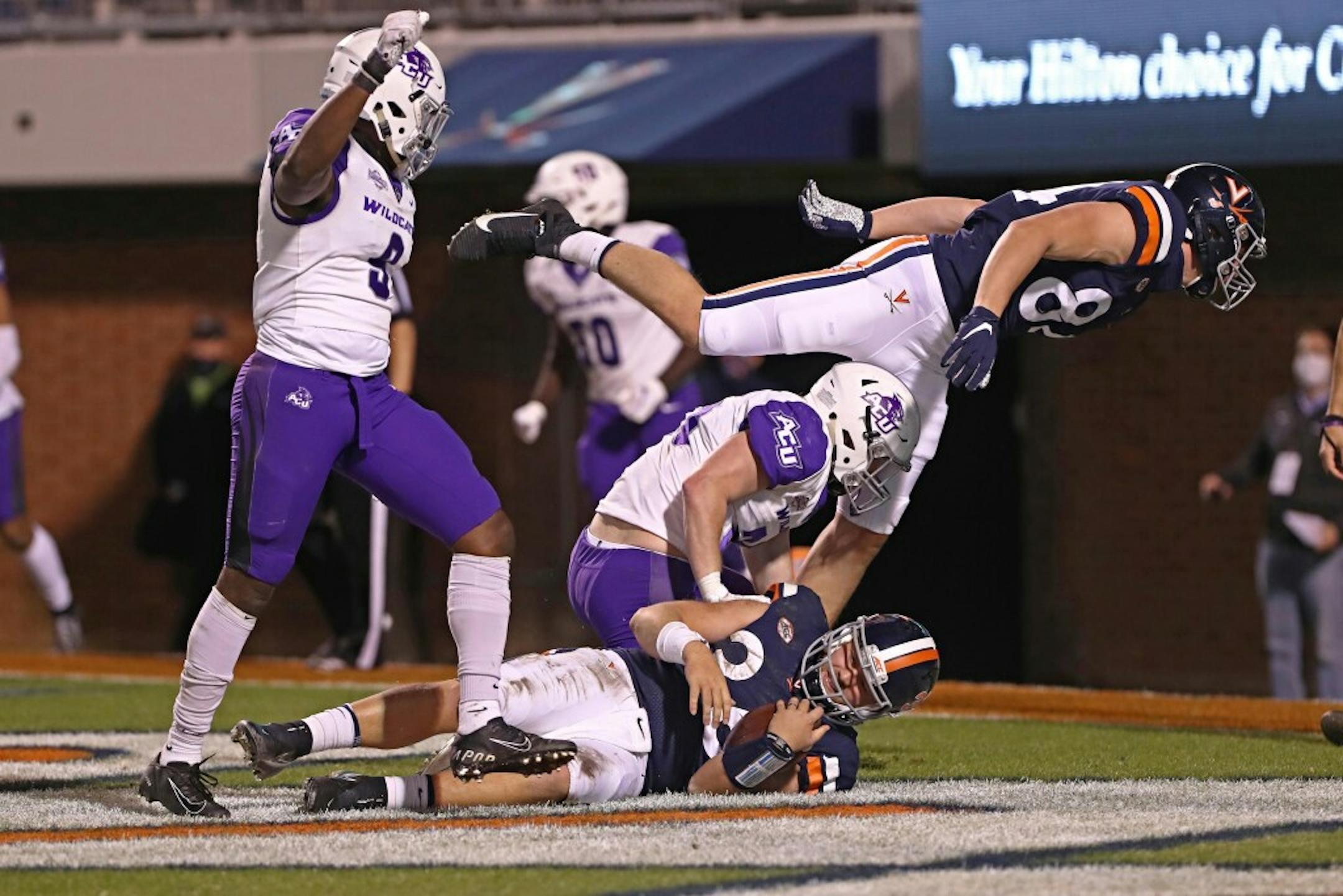 You would think so. Abilene Christian didn't even bother trying an on side kick. Instead, the ball went deep, where a Virginia player had to go retrieve it and fall on it at the 5 yard line. Fine. No worries. 1:25 left, Abilene Christian has just one timeout. Three plays and the game is over.