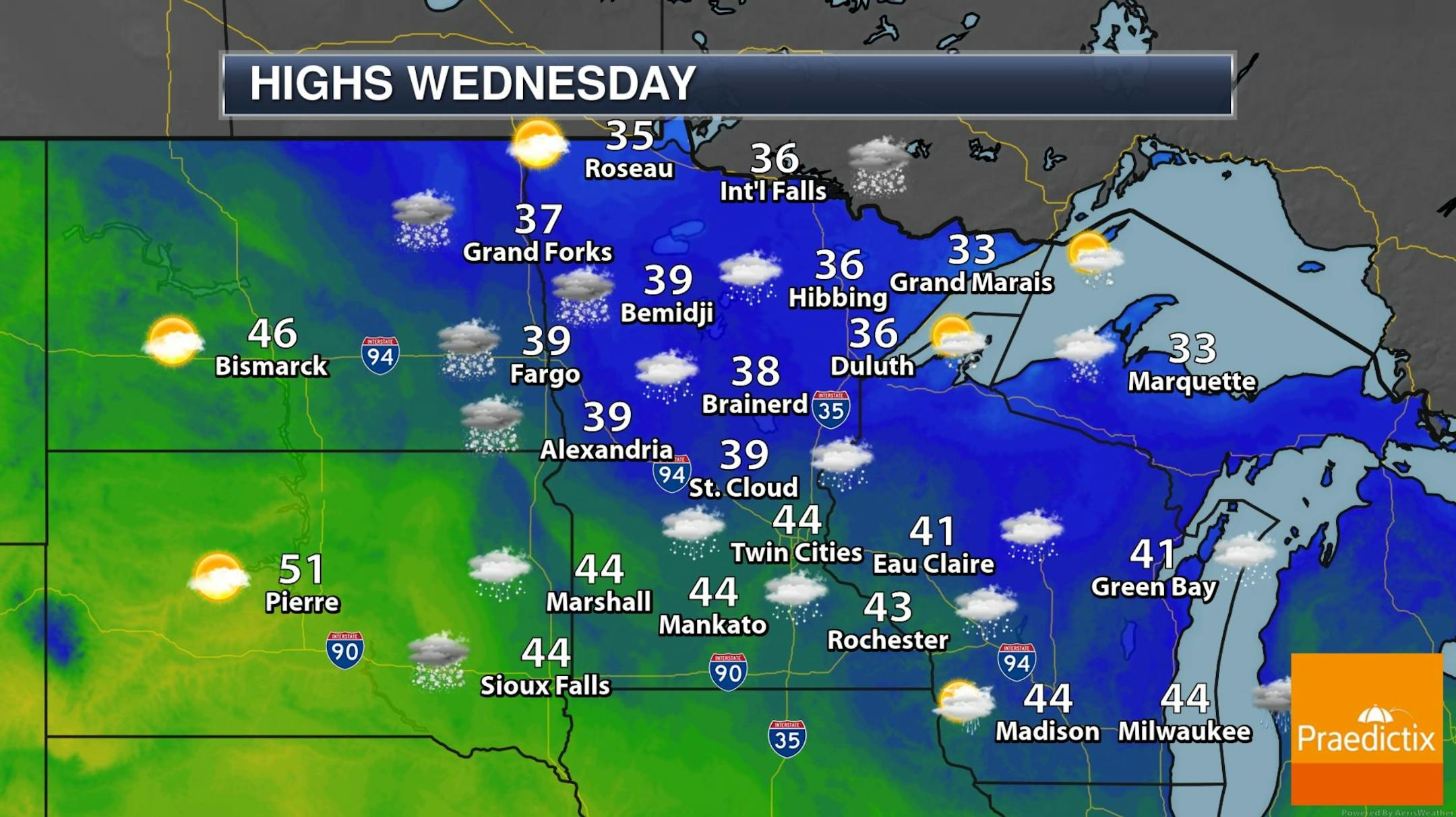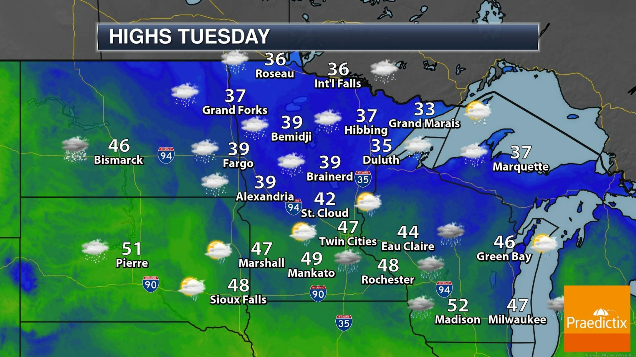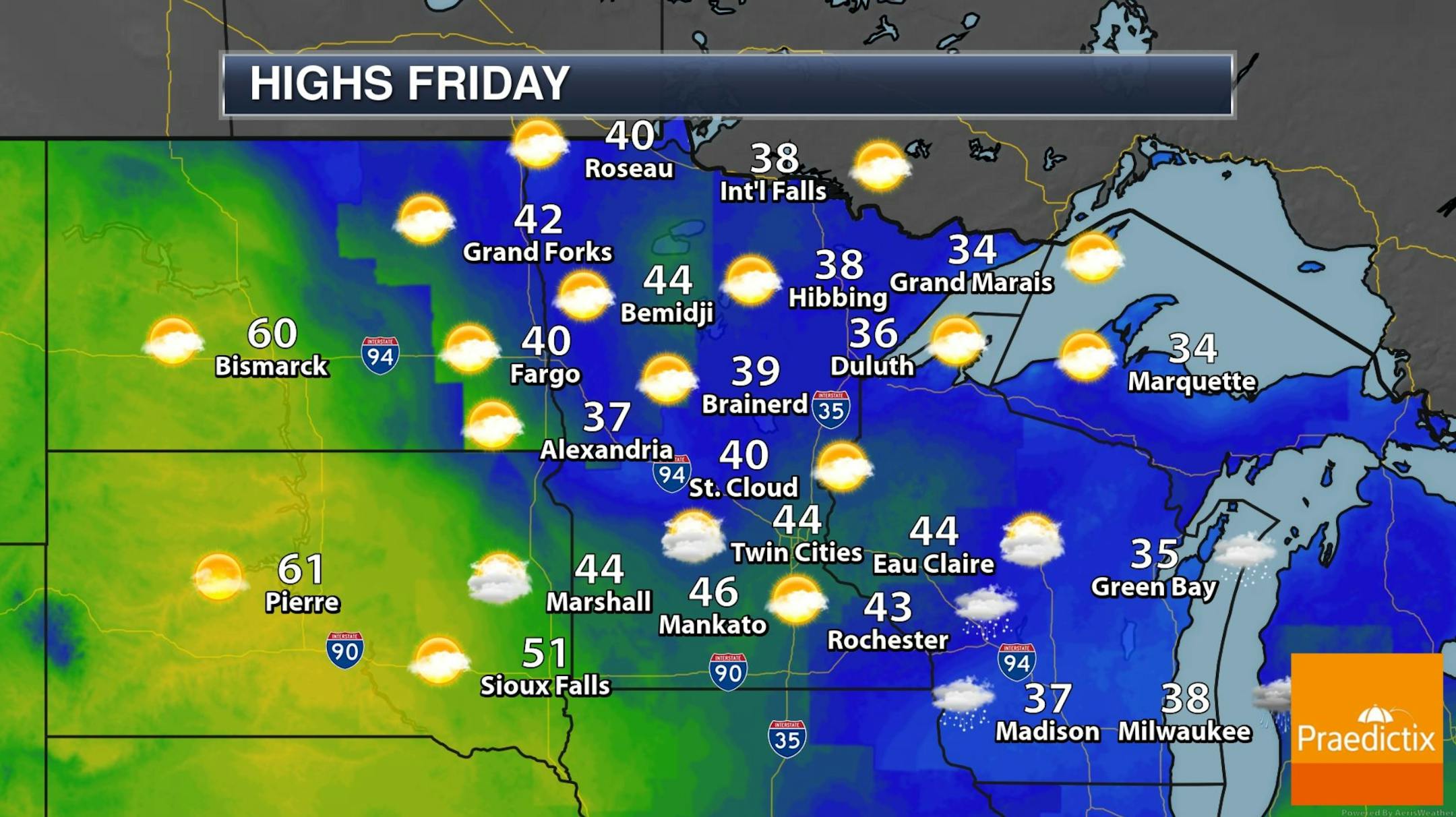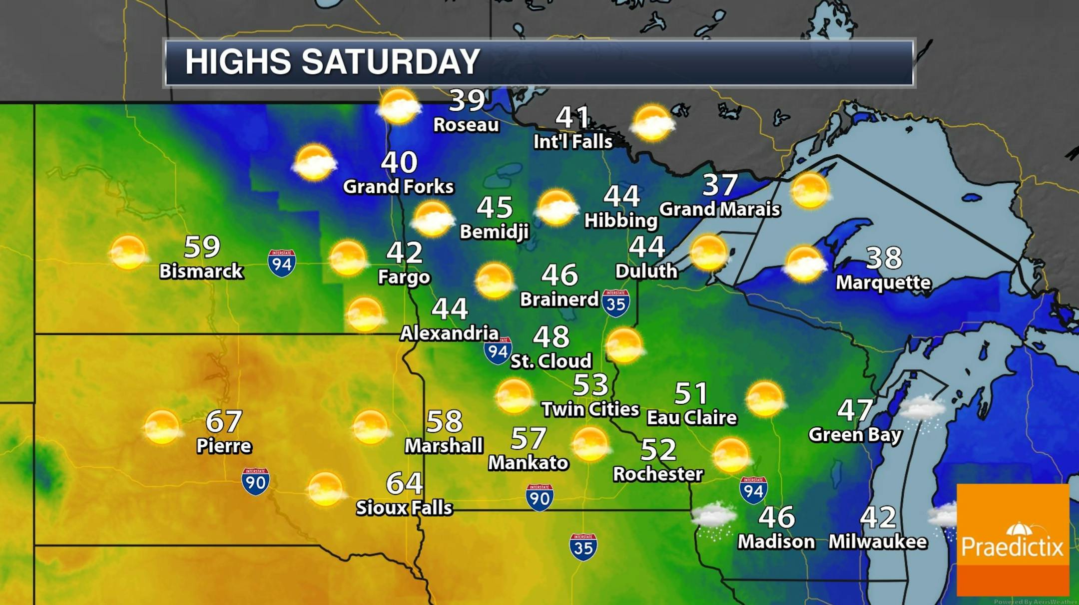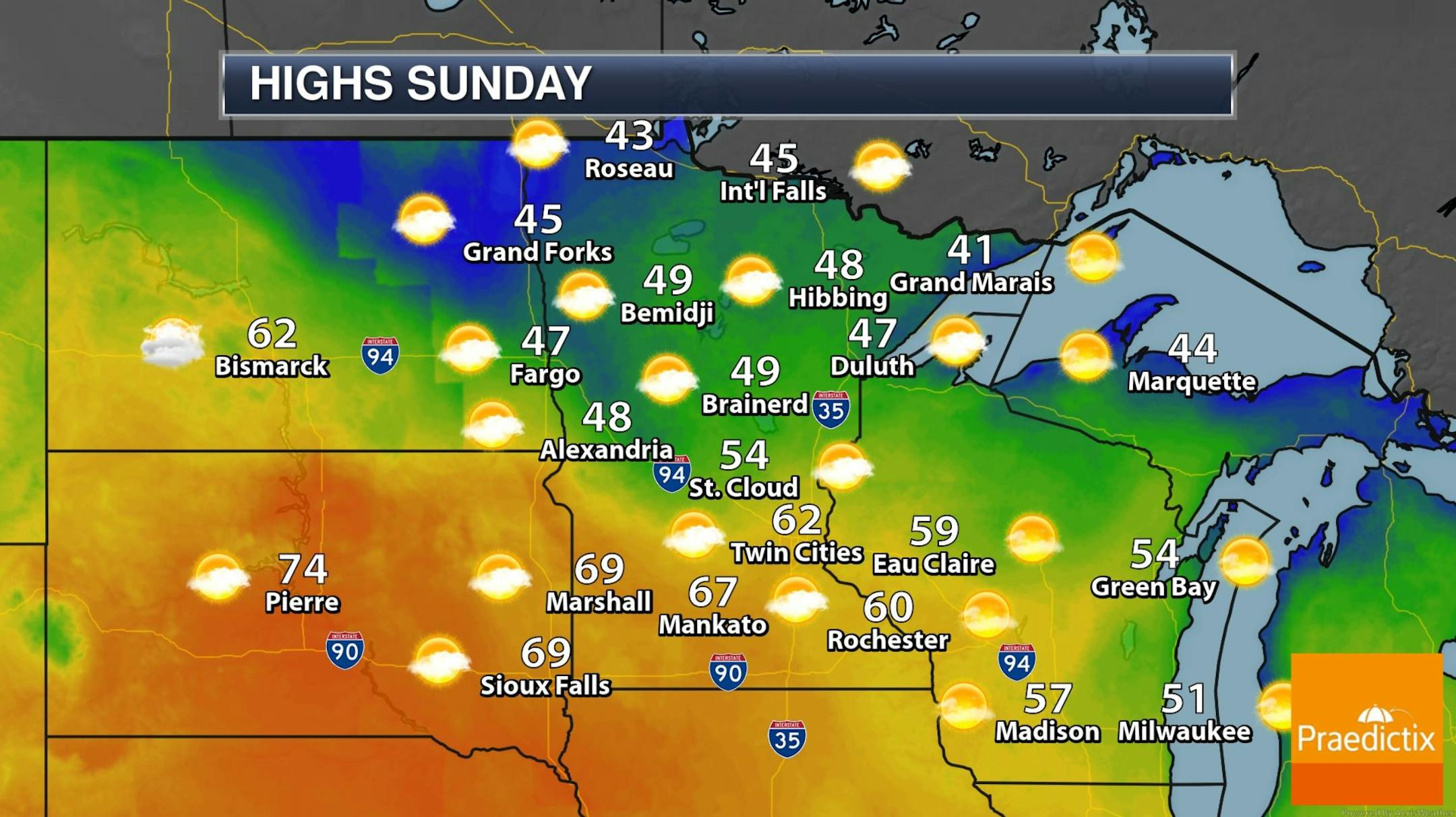 Stick Around for Sunday. Of all the days coming up Sunday gets the nod for the finest weather. We expect blue sky, light winds and afternoon highs in the upper 50s to near 60F, as much as 20F warmer than average for some Minnesota towns. A shower is possible Monday with steadier rain Tuesday, ending as a little slush Tuesday night as temperatures cool back down closer to normal next week.