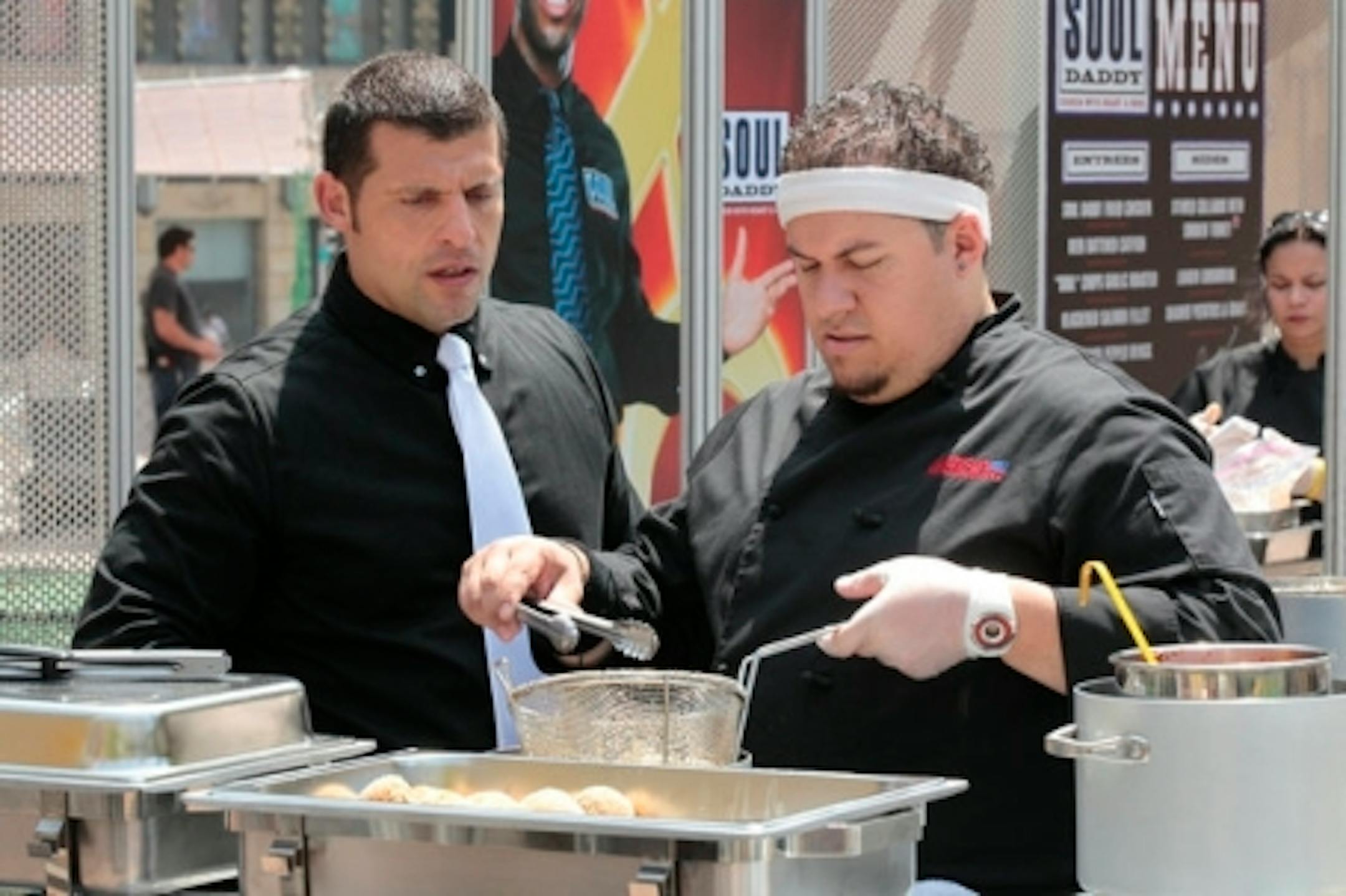 The rollercoaster continues at "America's Next Great Restaurant," and this week Eric of Meltworks (above) has fallen off. Lackluster dipping sauce! A design of a melting cog on his uniform! The judges were grumpy. In the first episode, Eric seemed to have the jump on the others because he'd been thinking about his concept for several years. However, the judges lamented, Eric was inflexible and "not growing with the concept." Last week the judges had said Eric had "plateaued." Ouch. The only grilled cheese we may see in the near future will be at home -- though Eric insists he will pursue his dream of fast-food grilled cheese on his own. In fact, he's quit his day job to do so.