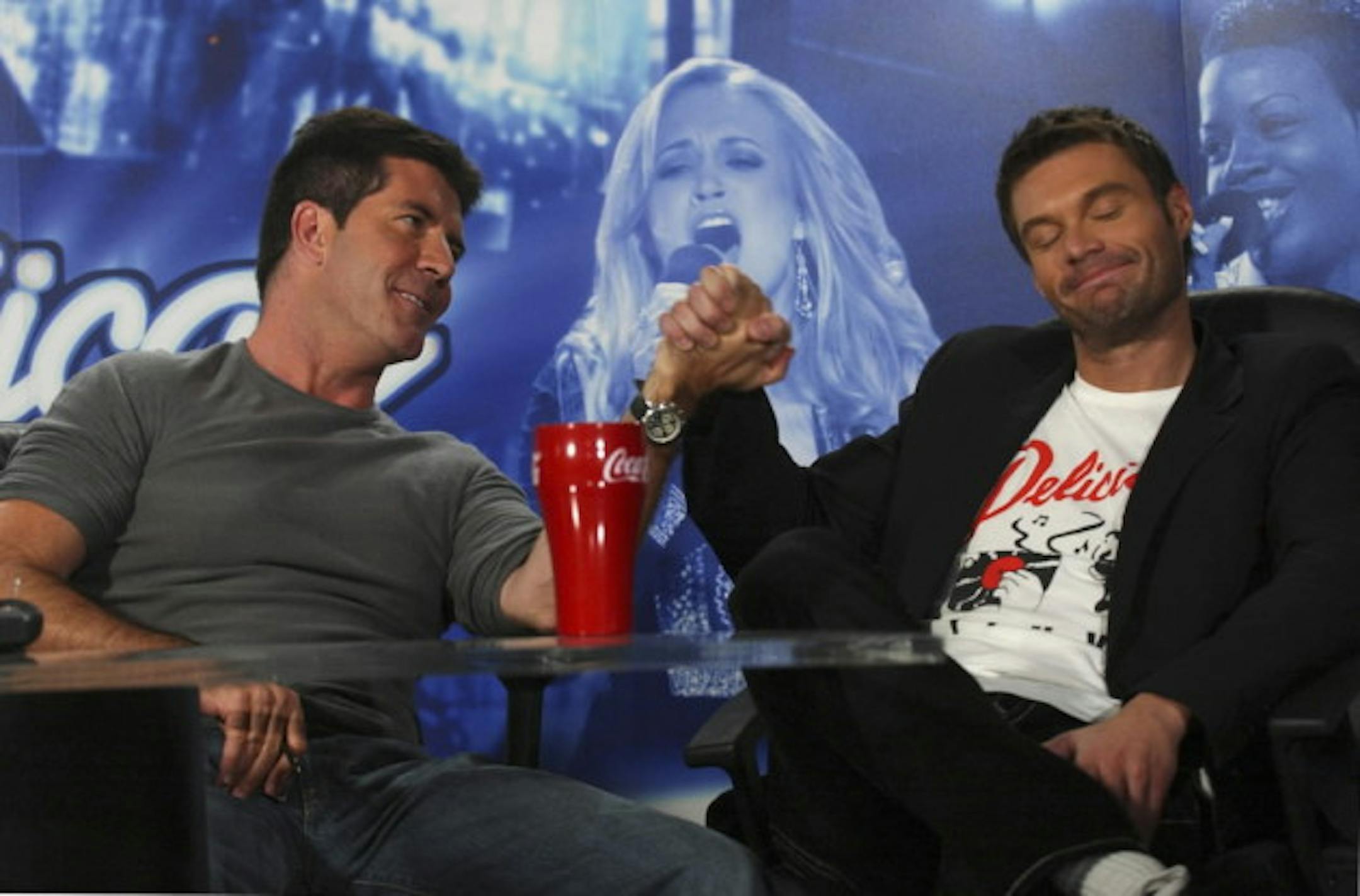 Simon Cowell and Ryan Seacrest at a 2006 press conference in Minneapolis/ photo by JOEY MCLEISTER