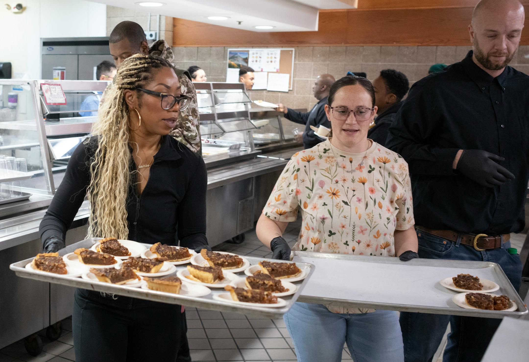 Aaliyah Hodge dished out pecan and pumpkin pie slices on Thanksgiving afternoon, asking each diner if they wanted whipped cream with their dessert.