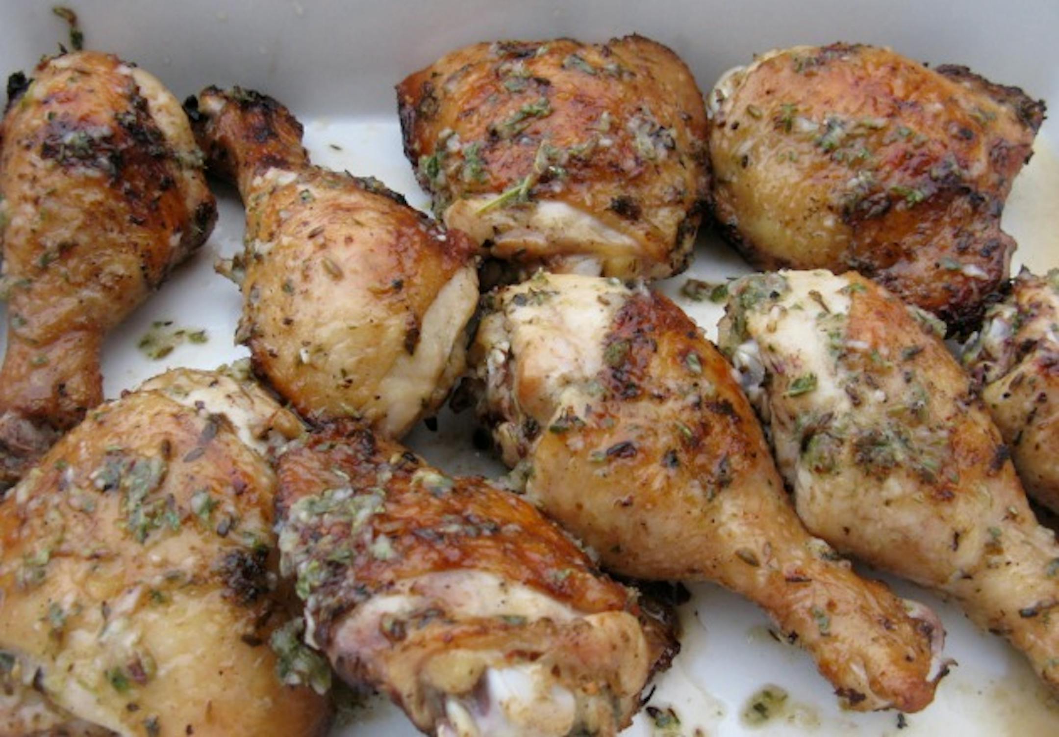 It has been ideal grilling weather this week, so I naturally turned to Traunfeld to tell me what to make for dinner. Easy: Chicken, marinated overnight in citrus, olive oil and herbs, served with a farmers market salad fortified with orzo. And it was easy. Rather than deal with a whole chicken -- which isn't exactly difficult, I know -- I bought the pieces I most prefer: drumsticks and thighs. The results were delicious, and the leftovers made for an excellent chicken salad.
