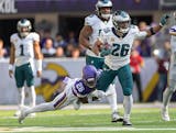 And on the Eagles’ final three drives, they faced third downs of 15, 13 and nine yards. Hurts, who finished with a perfect 158.3 passer rating, converted them all. He rolled away from pressure on a 28-yard completion to Devonta Smith and 13-yard throw to A.J. Brown before he beat a blitz with a 45-yard throw to Brown, who used a jab step to freeze Vikings cornerback Isaiah Rodgers.