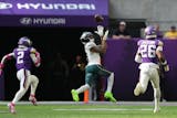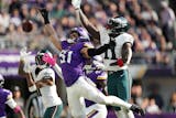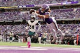There were four touchdowns in the game that covered at least 25 yards; Hurts threw three of them, while Eagles linebacker Jalyx Hunt had the fourth, dropping into a throwing lane to intercept Carson Wentz’s throw for Justin Jefferson and returning it 42 yards for a second-quarter touchdown. The Vikings reached the red zone six times, scoring a touchdown on just one of the trips while having one TD overturned by a Blake Brandel holding penalty and another by a replay review that determined T.J. Hockenson’s fourth-quarter catch had hit the ground.