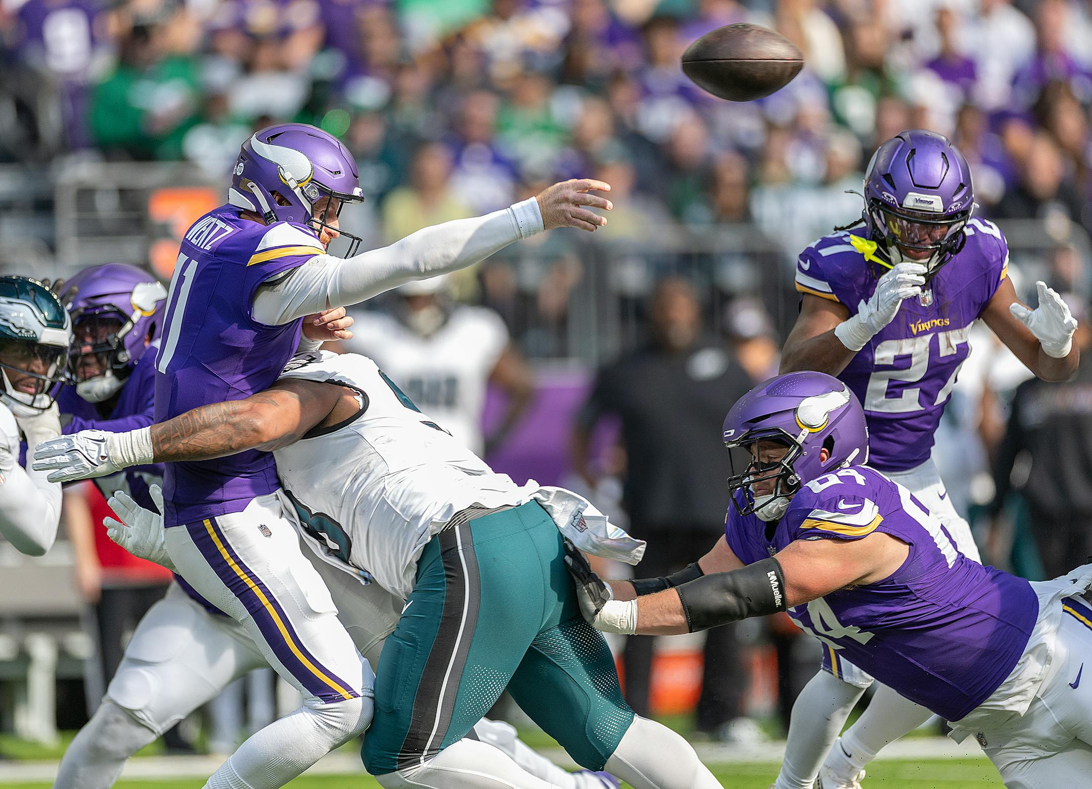 Three times, Philadelphia quarterback Jalen Hurts eluded the Vikings pass rush — twice with his legs, once with his quick release — and delivered blows that seemed to siphon the air from the building.