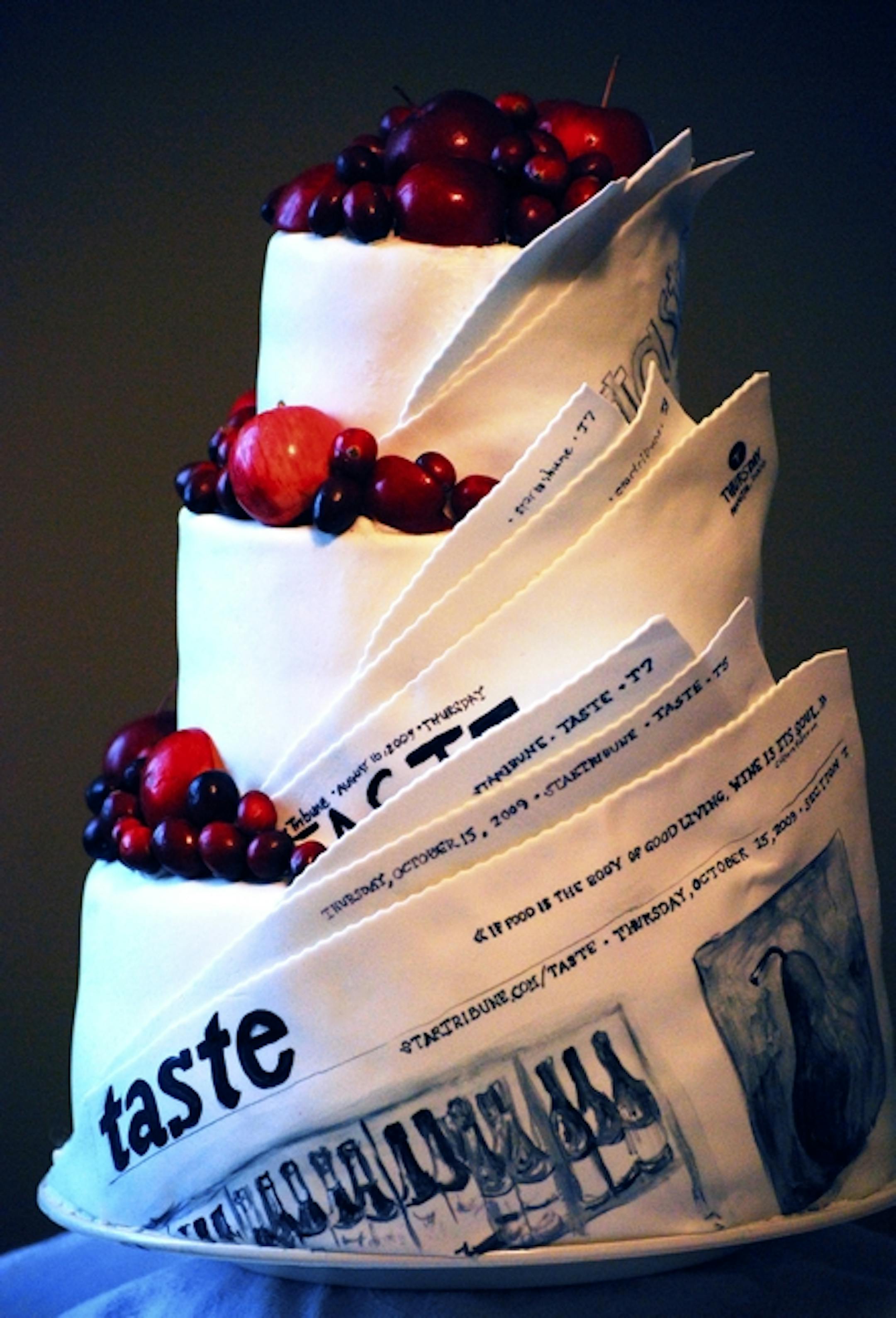 Not only is the cake topical, with an up-to-date Taste page, but a 40th birthday is a ruby occasion, so Jayne chose red fruit as decoration. Since she buys local as much as possible (she shops the Linden Hills Co-op), she wanted the fruit to be local, in this case cranberries and crab apples from Minnesota and Wisconsin. The cake is chocolate with mocha buttercream frosting. To see the 10 finalists, go to startribune.com/contests.