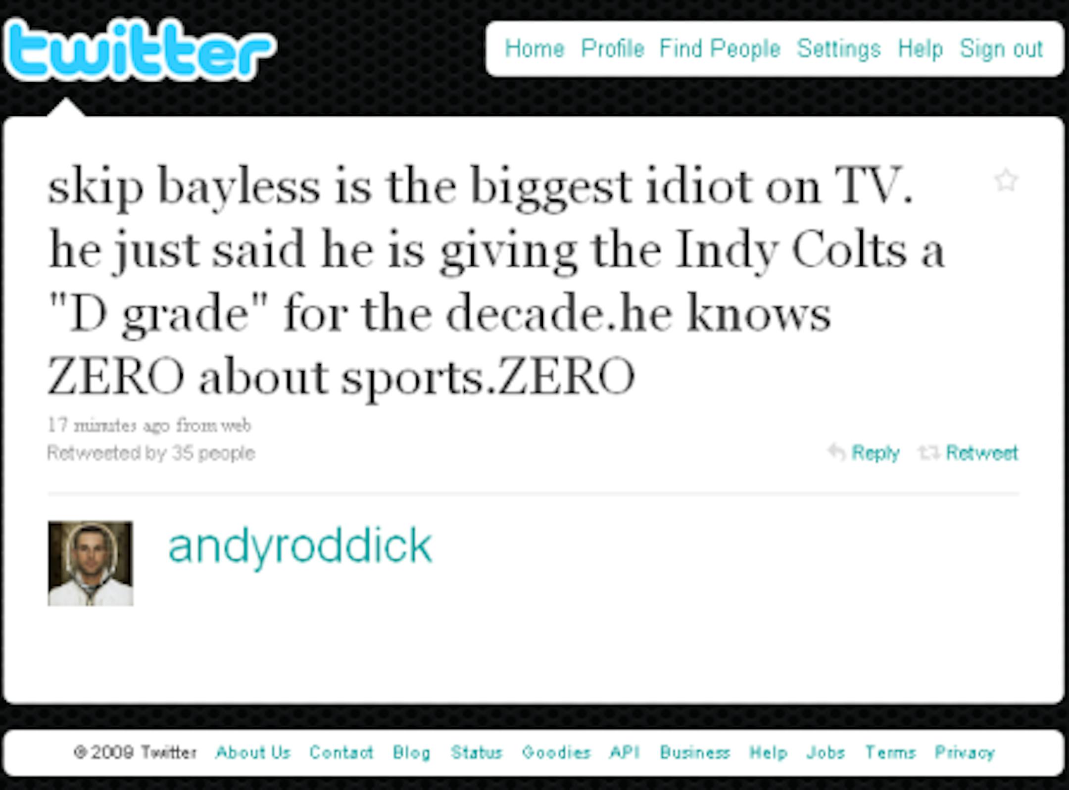 The best -- and worst part -- about Twitter is that you get the gut instinct opinions of pretty much anyone. That includes tennis player Andy Roddick, who apparently isn't a big fan of Skip Bayless.