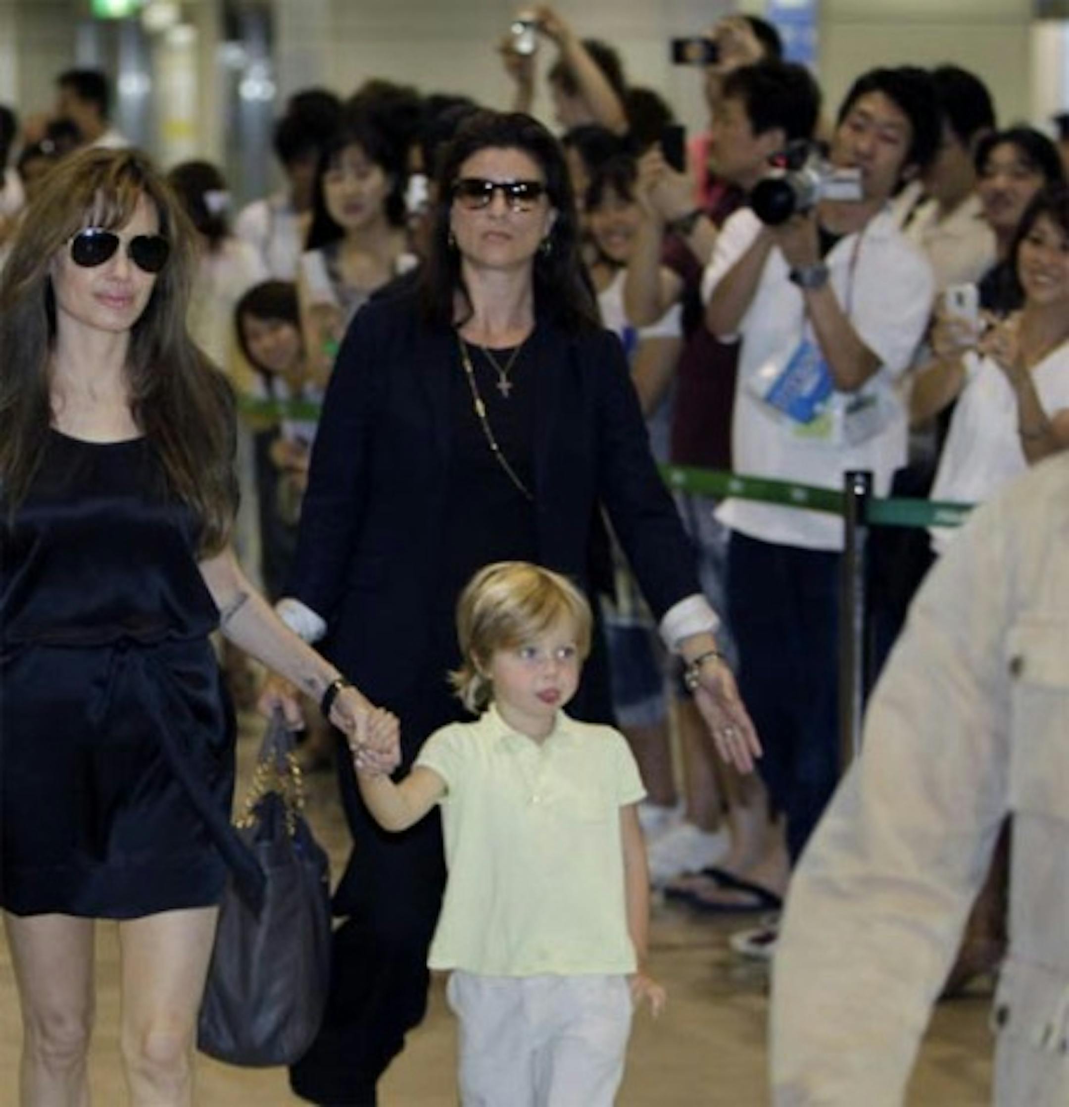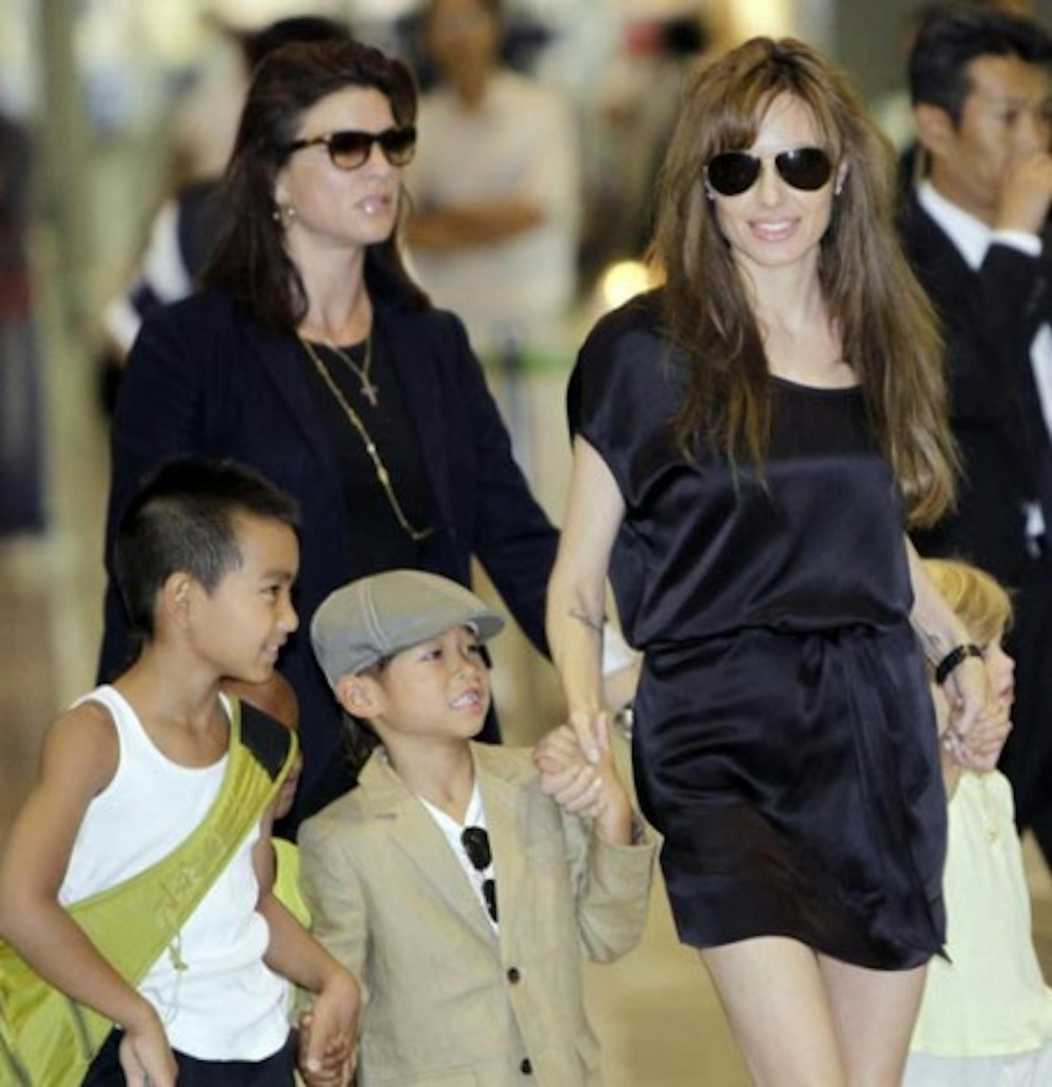 Lots of that going around. Dudding, I mean. Anyway, the movie's eventual failure or success has no impact on the press' desire to fire off 30 photographs-per-second every time she descends into the realm of mortal man. Here she is attempting to get four kids through an airport while strangers are taking pictures. Would you smile? If you'd been paid $20 mil for all this, yes. Yes you would.