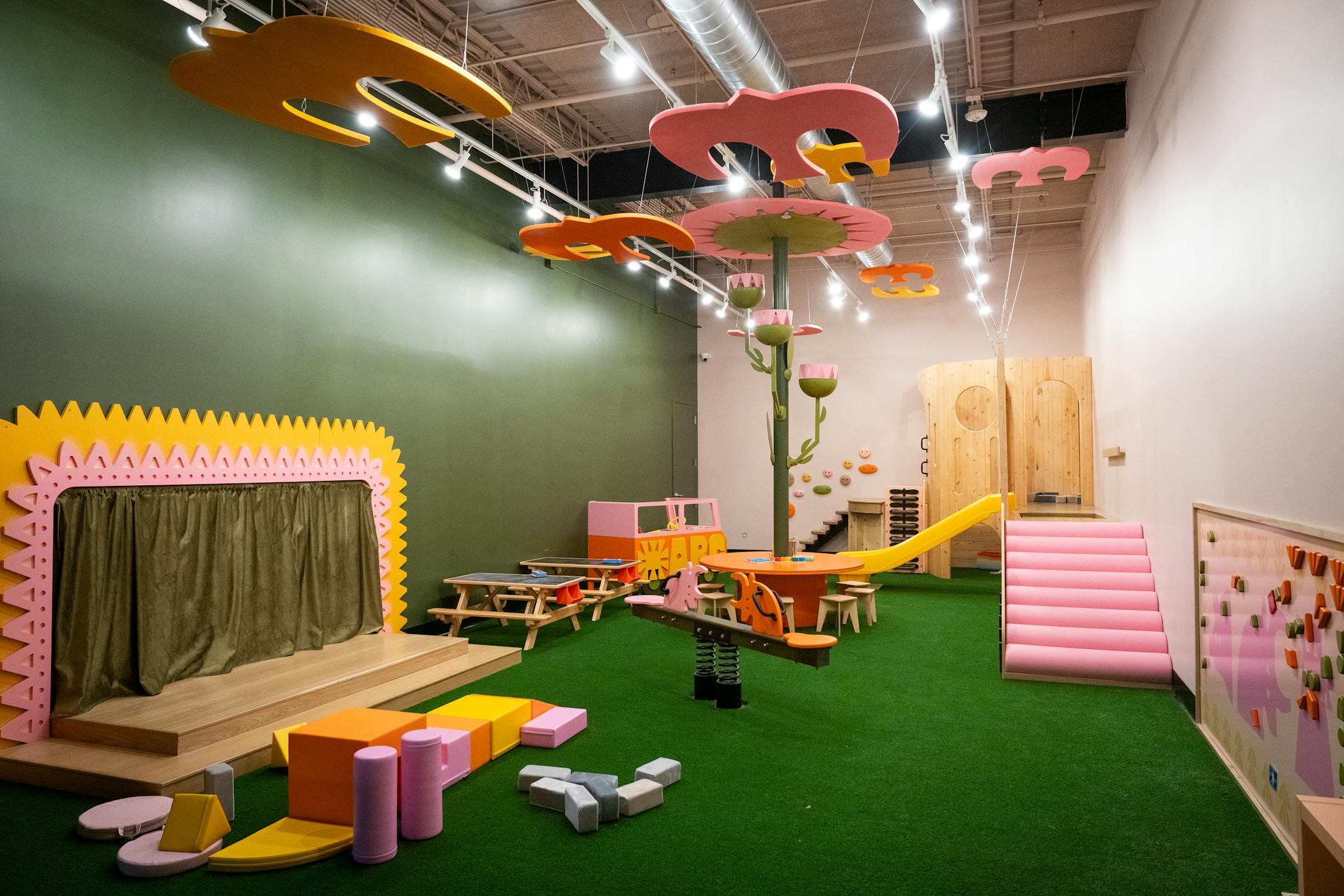 The focal point of the room is the stage, dark but illuminated with brightly colored icons. Off to one side is a bar, farther down is a whimsical play space. Walking through the restaurant, Wipfli noted the way the sound changes throughout the room.